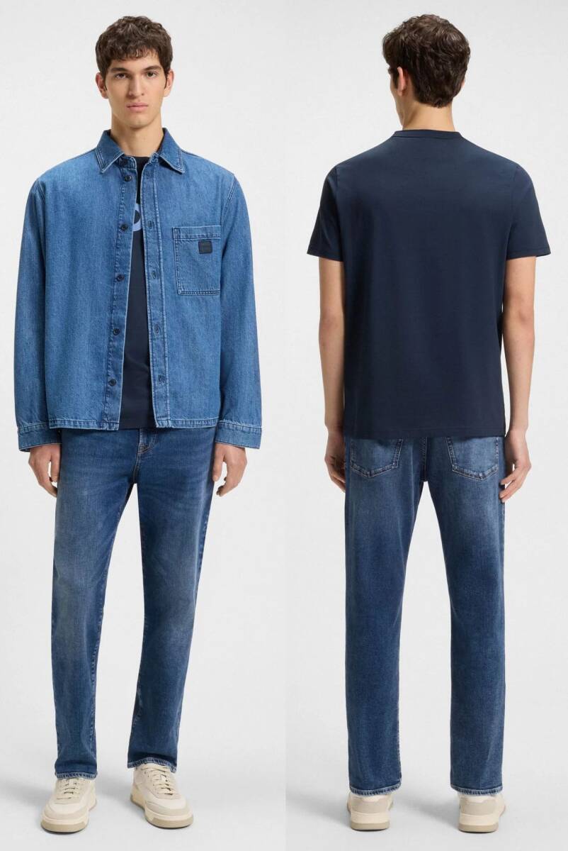 モデル名「MAINE メイン」。スタイルは「レギュラーフィット」太くもなく細くもない、通常幅ストレートレッグ。伸縮性豊かなストレッチデニム。数年着用の自然な色落ちを表現したウォッシュ加工が施された経年加工ジーンズ。今回のジーンズは昔の50年代60年代デニム地のようにムラのある不均一な色落ち具合が特徴です。これはもちろん昔のデニム地を使っているのではなく、スラブヤーンといって糸のところどころに長めの大きめの節を作った糸で織っているため、デニム地に斑ができ、洗いをかけると不均一な色落ちになります。BOSSはこれを「オーセンティックなデニム」と表現していますので、ということは50年代のような昔は糸を紡ぐと自然に節ができたということなのかなと思います。現代のような均一感のある糸ではなく、節のある糸が一般的だったということでしょうか。綿を紡ぐわけですからウールとは違いますから、素朴な不均一な節ができたのだろうと想像できます。今回のジーンズは意図的な節を作ったスラブヤーンのデニム地を使っているため風合いのある色落ちをお楽しみいただけるお品になります。