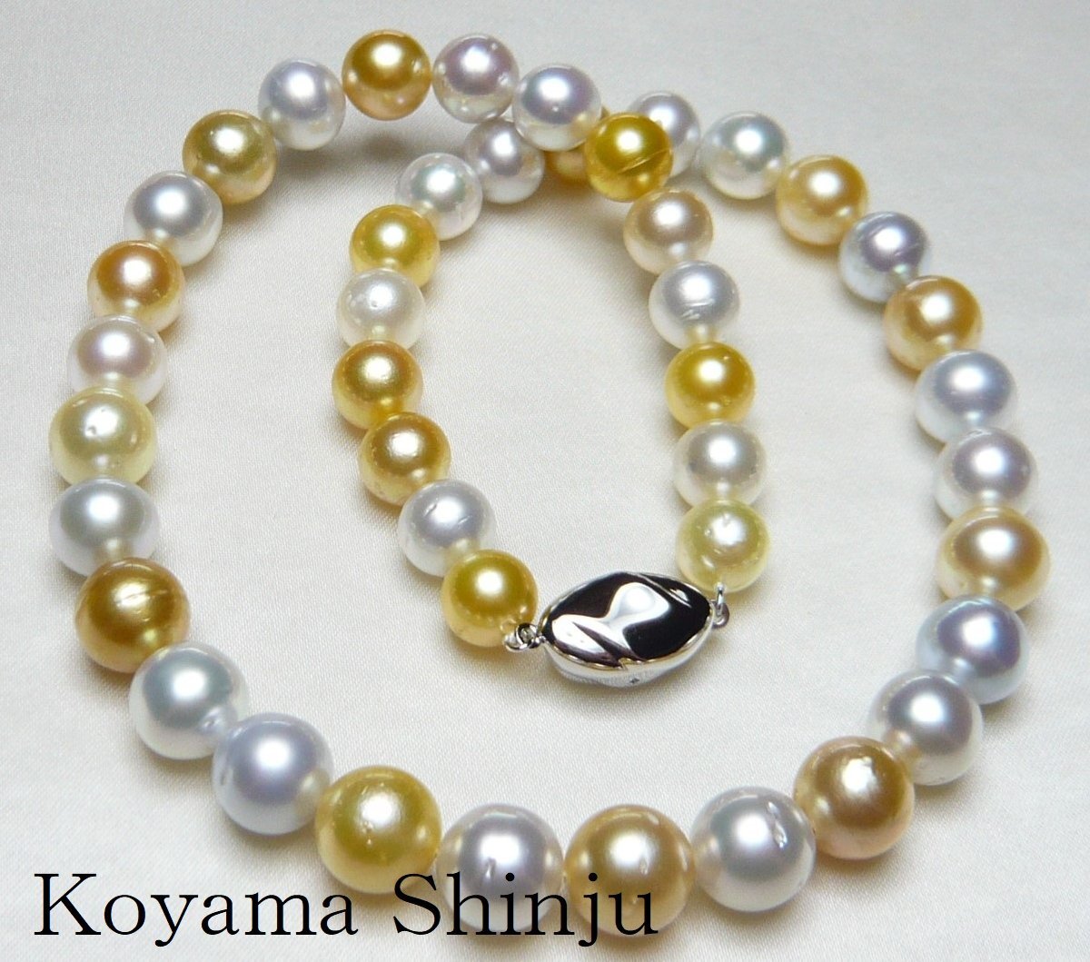 | 商 品 詳 細 | 即買特価!絶品カラー!白蝶真珠マルチネックレス! 即買特価!送料無料!絶品カラー!白蝶真珠マルチパールネックレスです。 天然カラーのホワイト、シルバー、グリーンピンク、ブルー、ブルーピンク、グレー、クリーム、ゴールド等のパールをバランスよく組み上げた可愛いマルチネックレスです♪ 画像では表現しきれない美しさです!めっちゃ綺麗ですよ! パールサイズも幅8.5ミリ-10.4ミリありますので、思ったよりボリュームがありますよ。 7枚目の画像は大きさが分かるようにあこや本真珠の7.0-7.5ミリネックレスを並べて撮影しましたが、明らかに大きさが違いますね! カラフルな仕上がりになりましたので、どんな服にも似合い、シーズンを通してお使い頂けますよ(^。^) クラスプは脱着容易なプッシュ式差し込みタイプです。 当方発行の保証書、お手入れクロス付きです。おまけもありますよ♪ 画像ですべてを表現できませんが、本真珠の証とも言えるキズ、エクボ、細胞痕等があります。 | ||