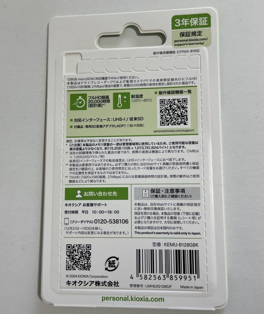 KIOXIA 高耐久microSDXCメモリカード 128GB UHS-I Class10 U1 V30 A1 100MB/s 4K SDアダプター付き KEMU-B128GBK 繰り返し録画向け