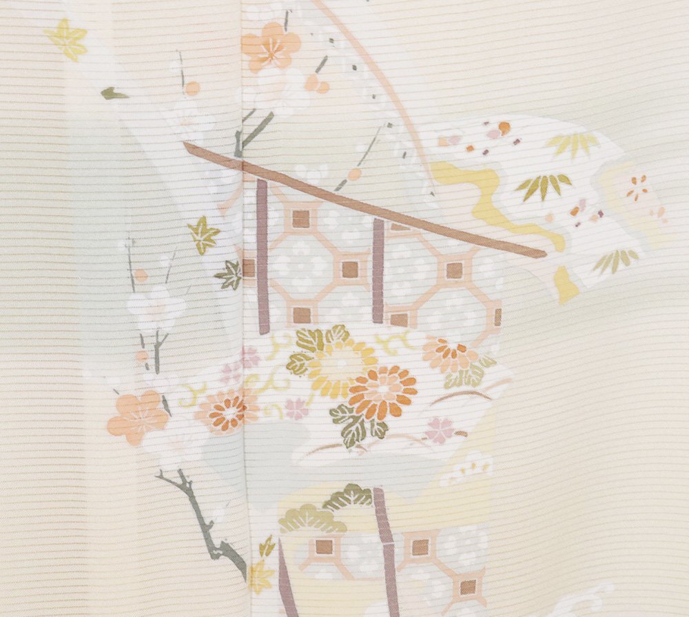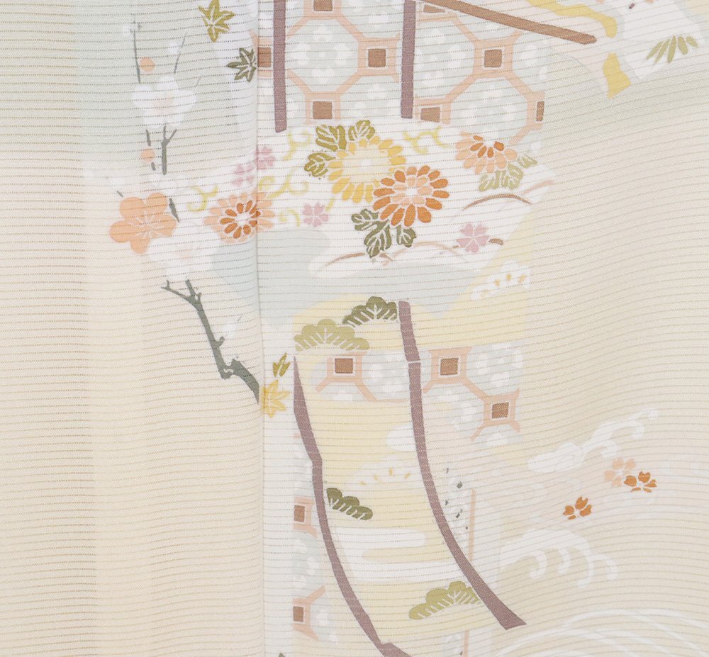 | 色・柄 | 絽 京友禅 訪問着 壺金生地 ベージュ・緑・霞暈し地 几帳・地紙文・貝桶 松竹梅 (写真では上手く色が出ない場合があります。ご了承下さい) |