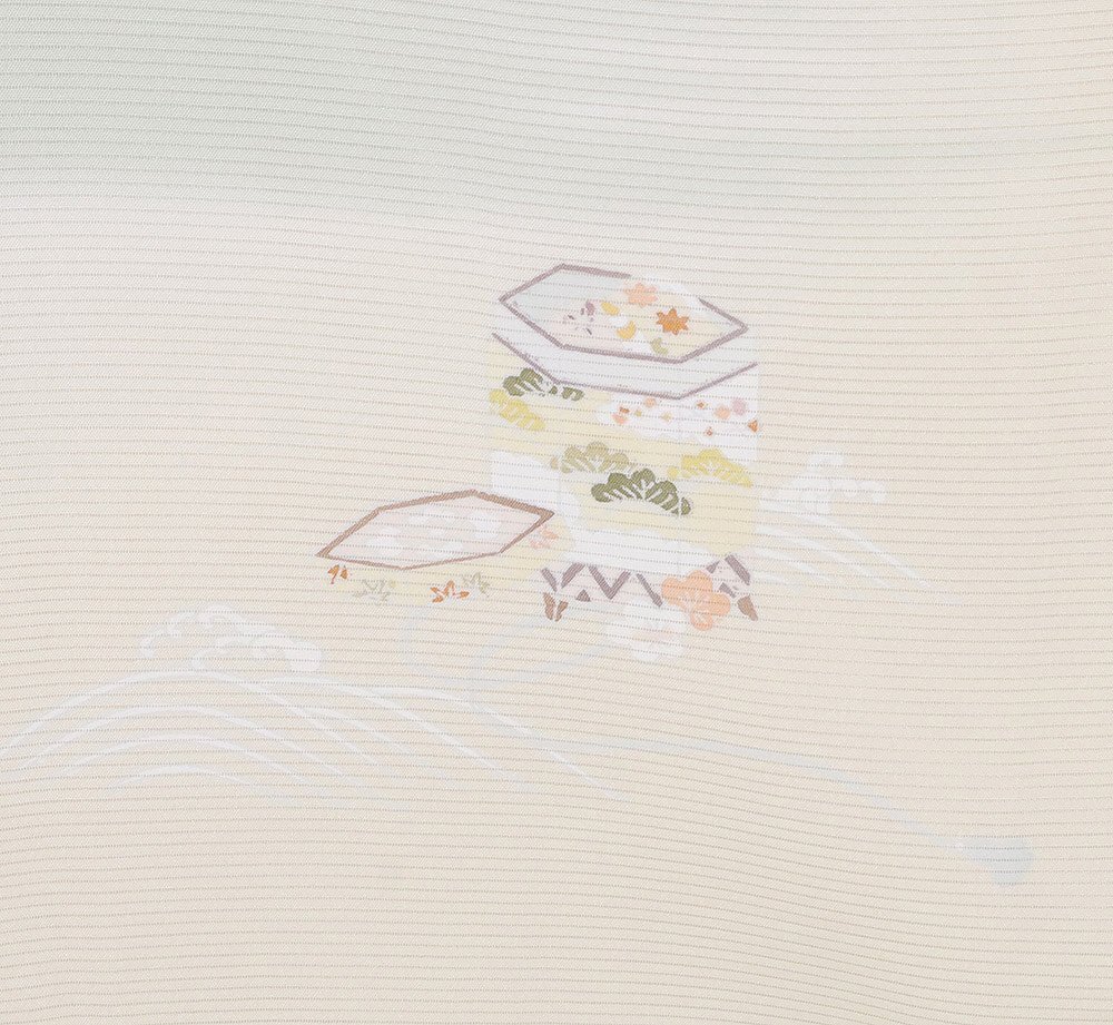 | 絽 京友禅 訪問着 壺金生地 ベージュ・緑・霞暈し地 几帳・地紙文・貝桶 松竹梅 169 広襟 居敷当て付き 新品 しつけ付き | |