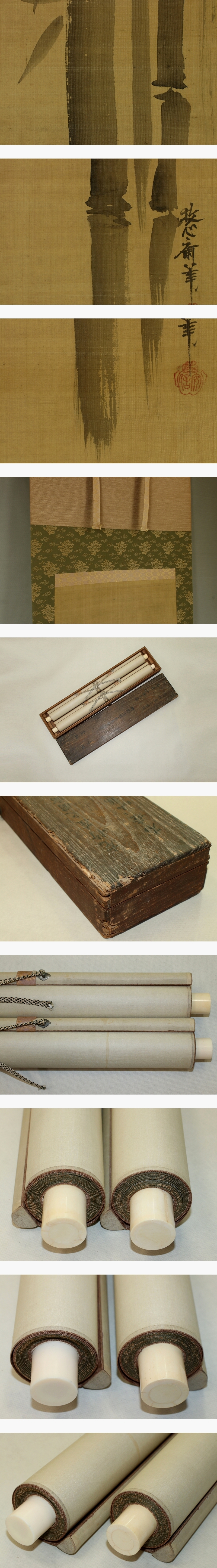 狩野安信 かのう-やすのぶ(1614-1685) 江戸時代前期の画家。慶長18年12月1日生まれ。狩野孝信の3男。 狩野貞信の養子となり,狩野宗家を継ぐ。 寛永年間(1624-44)に幕府の奥絵師として江戸で中橋狩野家を建てた。 御所障壁画制作に参加し,延宝年間には狩野派の最高指導者として紫宸殿の「賢聖障子」を描く。 貞享2年9月4日死去。73歳。京都出身。通称は四郎次郎,右京。号は永真,牧心斎。 本紙は、染み、汚れがあります。 表装は、軽い染み、軽い皺、ヤケ、虫食い、軸先にヒビ、箱に虫食いがあり、 軸先の種類が違うものがあります。 【サイズ】 作品 横約41.5cm×縦約100.5cm 表装 横約54cm×縦約187cm |