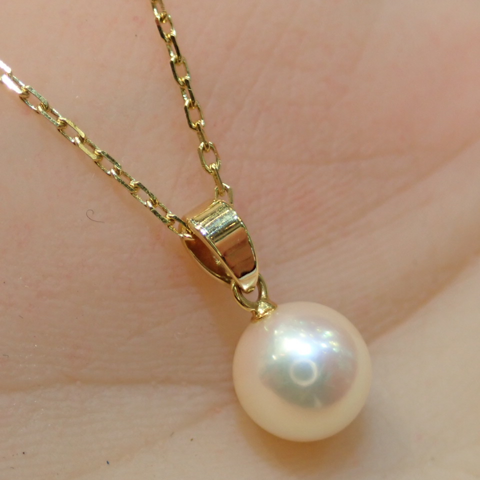 約7.6mmのアコヤ真珠を使い、シンプルで飽きのこないデザインで、