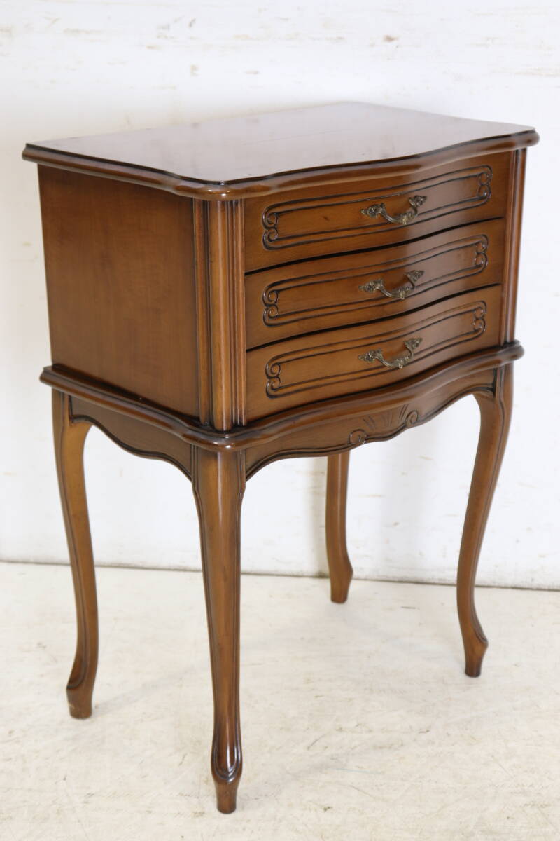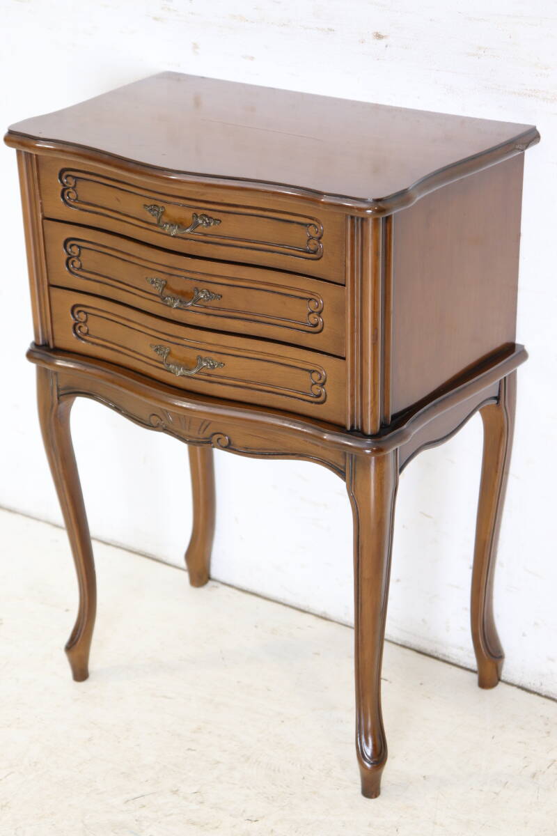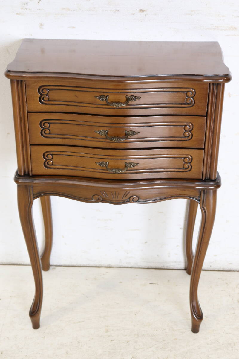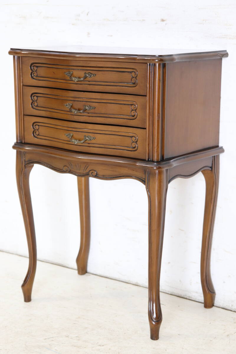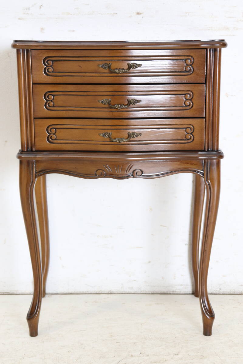 繊細なレリーフが施された3杯の引き出し、猫脚スタイルのエレガントな脚部、そしてクラシカルなブロンズ調の取っ手金具が、上品で高級感ある佇まいを演出しています。