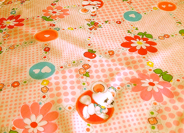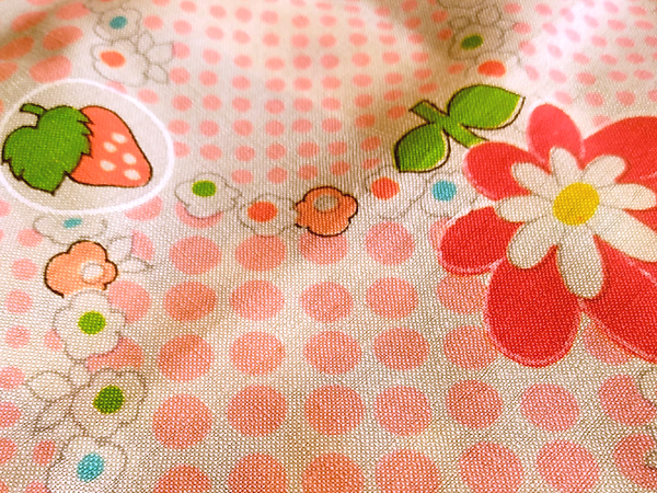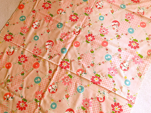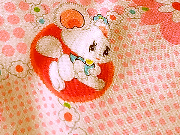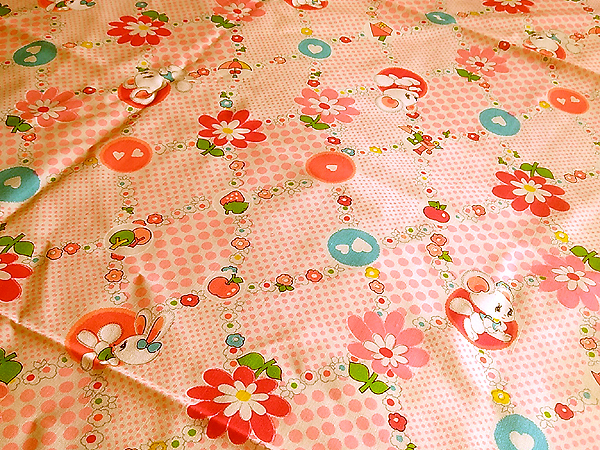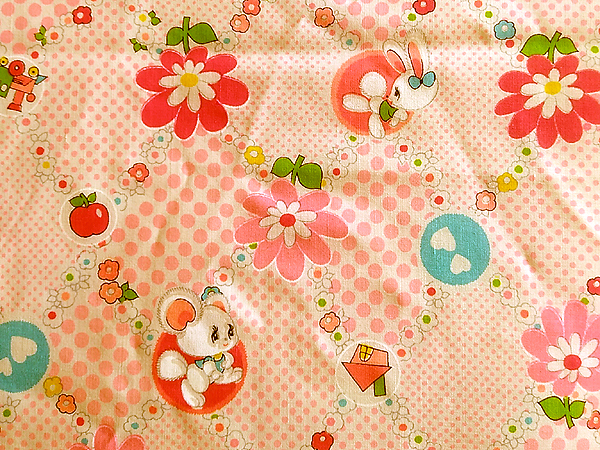 昭和レトロ 時代物 生地 綿モスリン リス うさぎ 水玉 W74×116cm ピンク系 花 ハート りんご イチゴ 家 傘 生地 はぎれ 1m 16cm