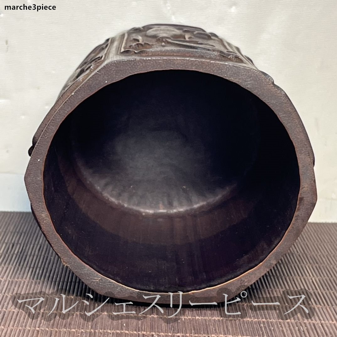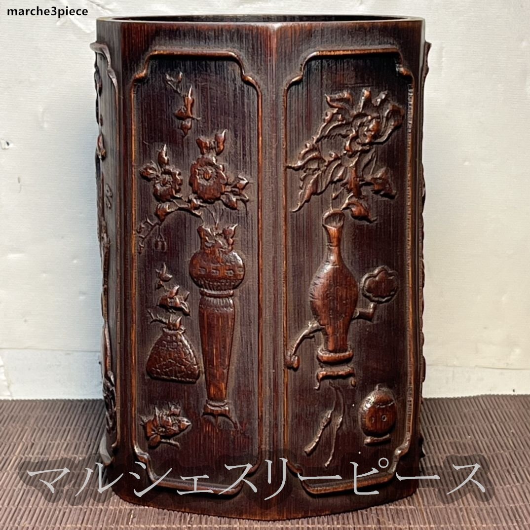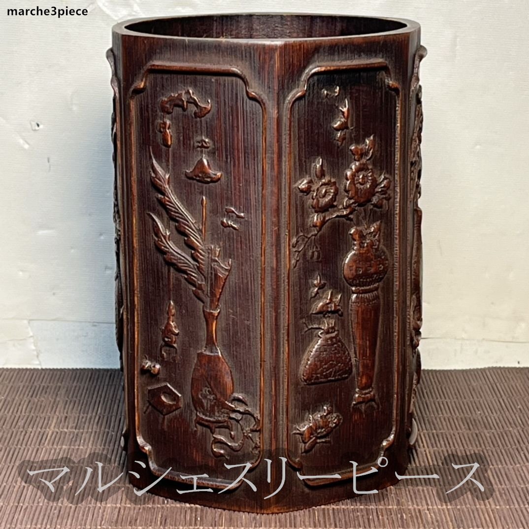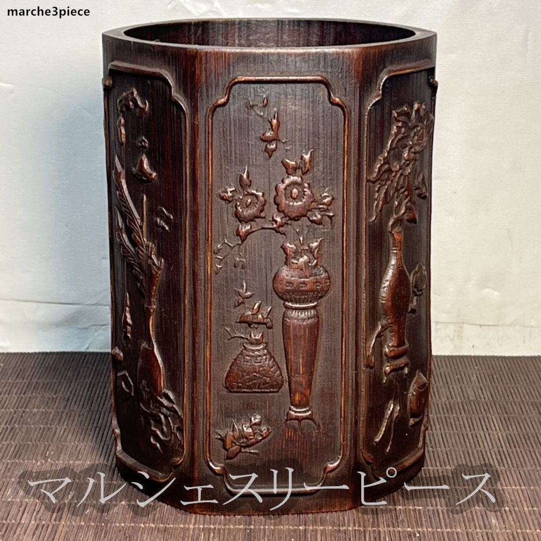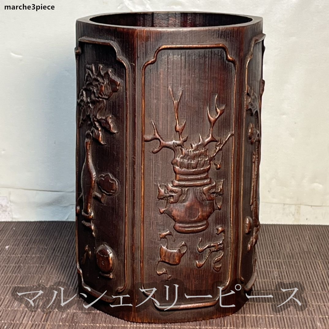 美術品 レトロ調 竹製 六角形彫刻 ペン立て 文房四宝収納ケース・置物
