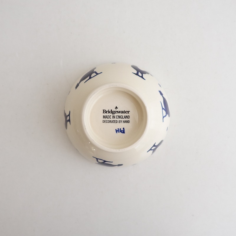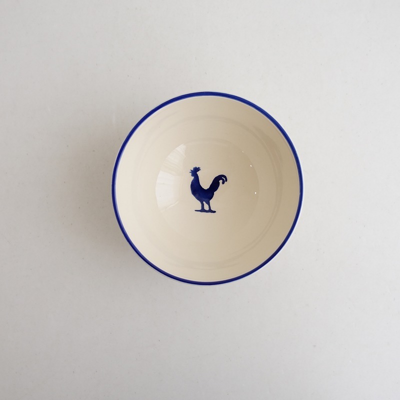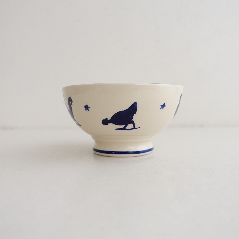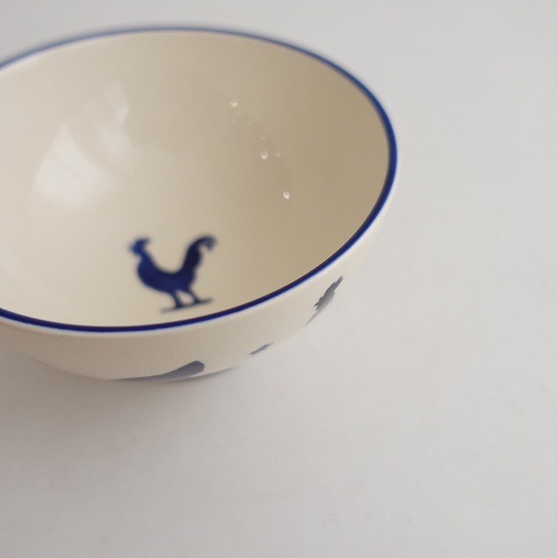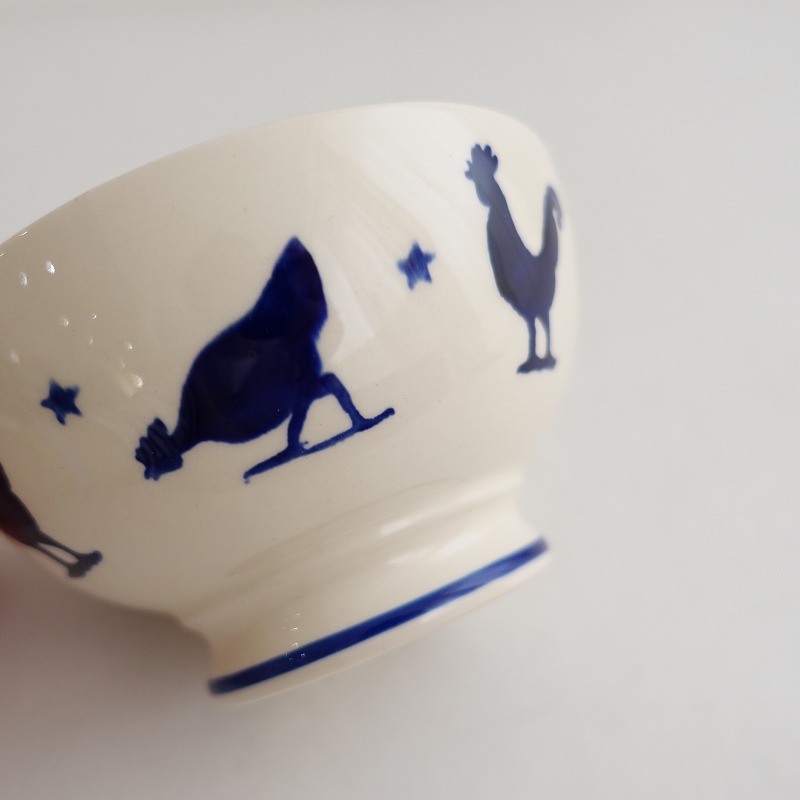 | Emma Bridgewater のカフェオレボウル 14㎝です。 カラーはクリームホワイトベースにブルーでニワトリが描かれています。 カフェオレやスープにちょうどいいサイズ感です。 |