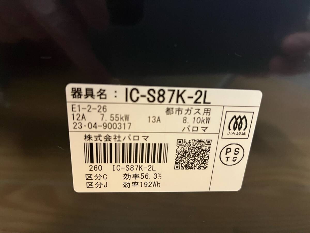 2023年製 パロマ IC-S87K-2L グリル付きガステーブル 都市ガス用 ガスコンロ ガステーブル 水なし片面焼