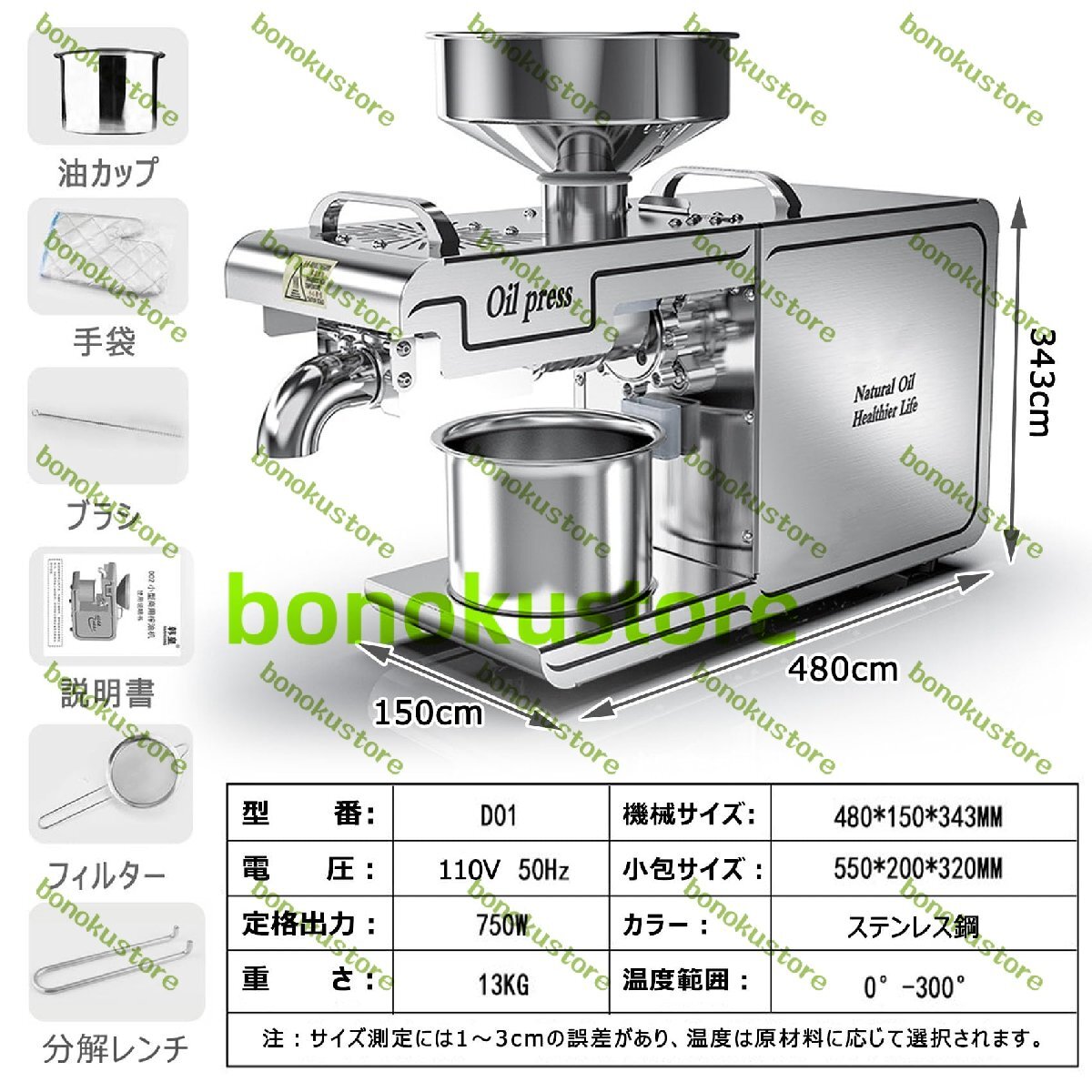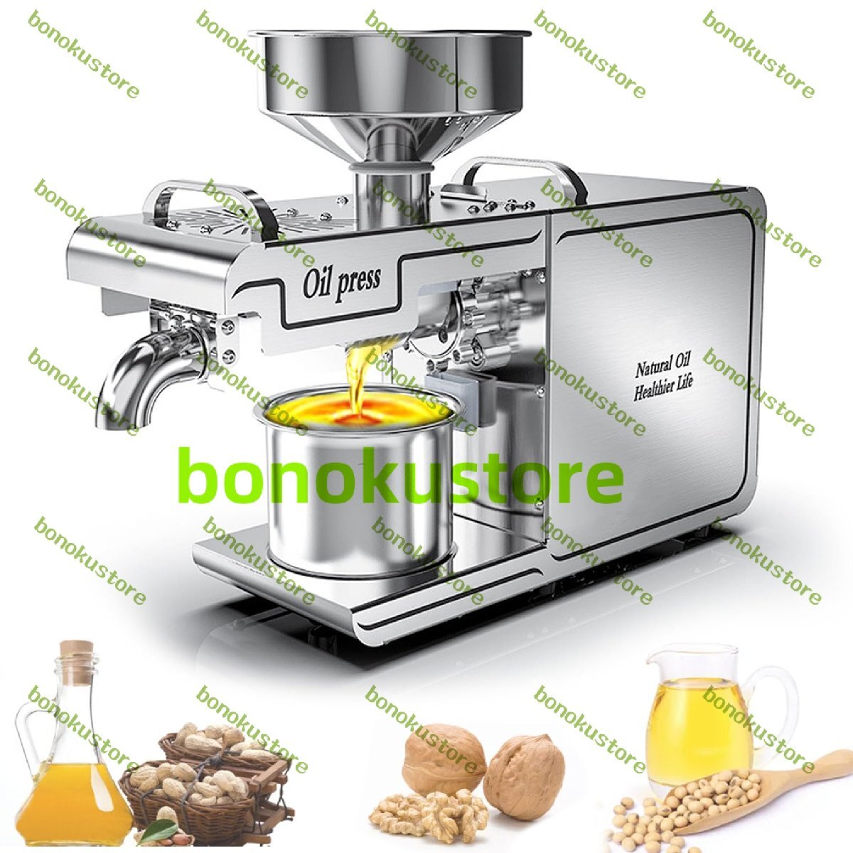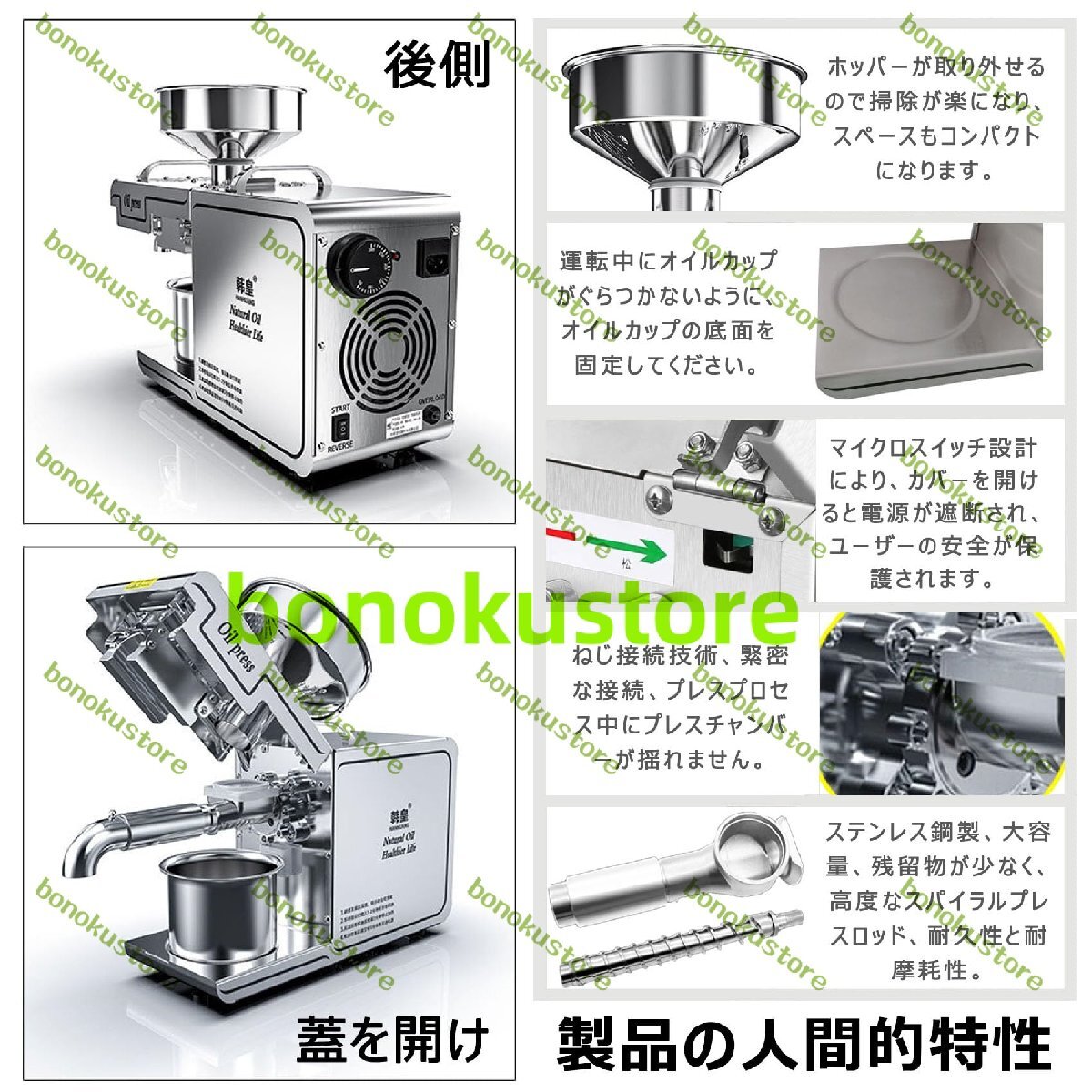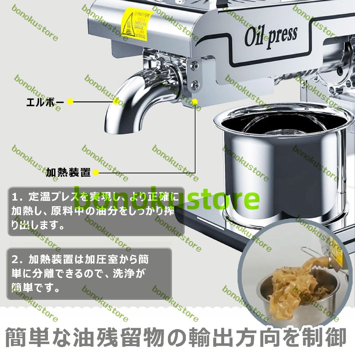 説明:自動オイルプレス機は、家庭や業務用での油抽出に広く使用されています。落花生、大豆、菜種、くるみ、ごま、ひまわりの種、アーモンドなど様々な原料に使用できます。特にピーナッツの圧搾に使用すると、油の排出量がより明確になり、油の生産量が増加します。仕様名前: 電動油絞り器電圧: 110V材質: 304 ステンレス鋼。高温モードでの作業後は、機械を取り外し、高温用手袋を着用してください。オリーブオイルには適しません。