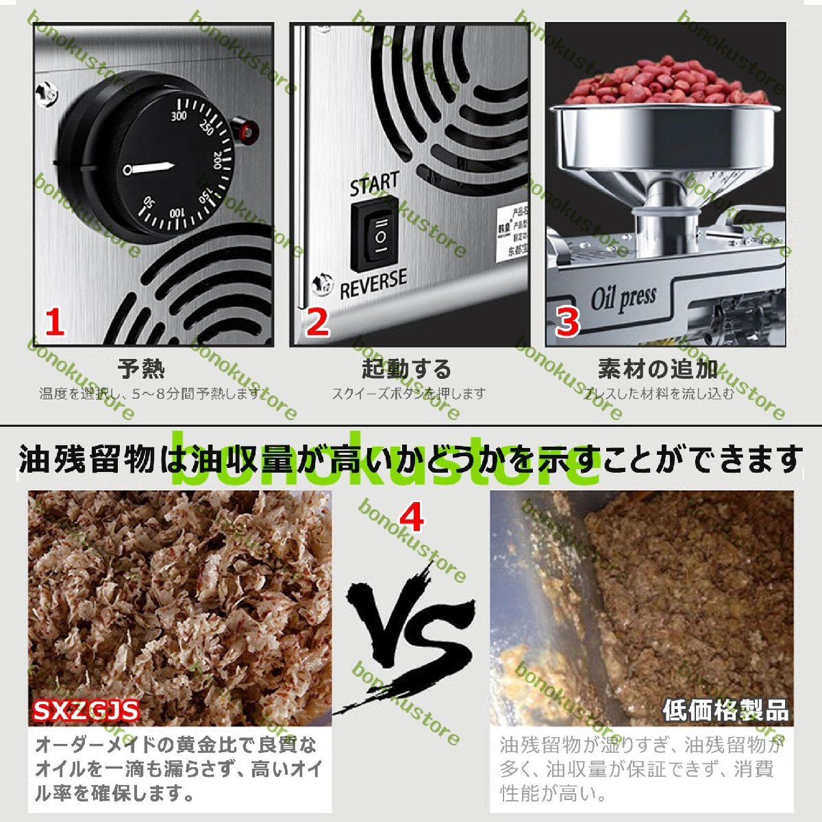 【電動油絞り器】油搾り機は豆、ピーナッツ、ゴマ、ヒマワリの種、クルミ、カボチャの種などに使用できます。 HEATボタンを押して約3分間予熱し、油を押し込みます。次に、種子をホッパーに入れてスタートを押すと、自動的に処理されます。