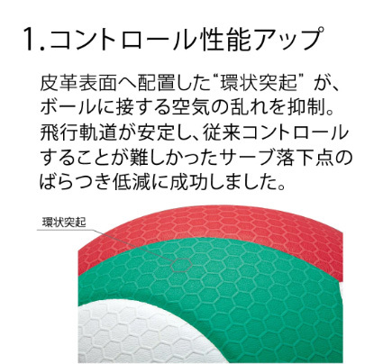 ・コントロール性能がアップ ボールに接する空気の乱れを抑制、従来コントロールするのが難しかったサーブ落下点のばらつきを低減します。