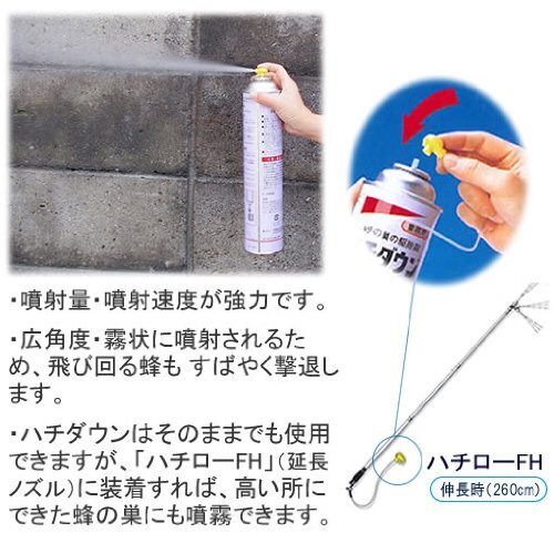 ・ 730ミリリットル (x 1) ・業務用量タイプのスズメバチ駆除殺虫剤。広角噴射で広い範囲をカバーし飛来したハチも一気に駆除。・通常エアゾールに比べて噴射量、噴射速度が強力で、広角度噴射によって飛び回る蜂も素早く撃退します。・1本730ml入りの大容量の業務用タイプ。しっかり噴霧できて安心して駆除作業ができます。・2種類の即効性の高い成分を配合し、スズメバチやアシナガバチなどを一気に駆除します。蜂の巣駆除や巣の予防にも最適です。・薬剤の到達距離はおおよそ2m前後ですが噴射量、噴射速度などが強力で、蜂駆除に最適です。商品の説明 ジャンボ缶タイプの業務用蜂の巣駆除です。通常エアゾールに比べて噴射量、噴射速度が強力で、広角度噴射によって飛び回る蜂も素早く撃退します。 【消防法】第四類第三石油類 【毒物及び劇物取締法】非該当 【国連番号】1950 【クラス】2.1 【品名】可燃性エアゾール類【容器等級】3 商品特長 広角霧状噴射で飛び回るハチを撃退 ノックダウン効果作用のある成分と致死作用のある成分の二種類を配合してあります。 大容量なので安心して駆除作業ができます。 薬剤の到達距離はおおよそ2m前後ですが噴射量、噴射速度などが駆除に最適です。 使用方法 巣を安全に処理する為に風上から大量にハチダウンを噴射して下さい。 巣の出入り口からも大量に薬剤を注入して下さい。飛び回るハチには直接噴霧して下さい。 ハチが巣から落下するのを確認してから巣の基元を残すことなく巣全体を取り除いて下さい。 薬剤が無くなる場合がありますので予備を1缶用意して下さい。 使用上の注意 定められた使用方法を厳守すること。 使用用途以外には使わないで下さい。 直射日光のあたる場所、高温になる場所での保管は避けて下さい。 子供の手の届かないところに保管して下さい。 その他、使用上の注意をよく読んでから使用すること。 使用上の注意 ※本剤を使用する時は、防護服を着用して下さい。※ハチの巣を除去する時は、噴霧後ハチが死んでいる事を確認してから行って下さい。 原材料・成分 ・有効成分:d-T80フタルスリン、d-T80レスメトリン ・性状:無色透明液体 ・適用害虫:スズメバチ、アシナガバチ等の蜂 ・内容:1本(730ml) ・缶サイズ:直径67×高さ320mm 使用方法 (1)エアゾール缶のままでもご使用いただけます。ハチの巣に向けて直接噴霧してください。 ※ハチダウンに専用の延長ノズル「ハチローFH(別売)」を取り付けることことで、高所でも安全・確実にスズメバチの巣を駆除できます。その際は、噴射口のボタンを付替えてご利用ください。 ご使用前には取扱説明書をよく理解し用法・用量を正しく守ってご利用ください。