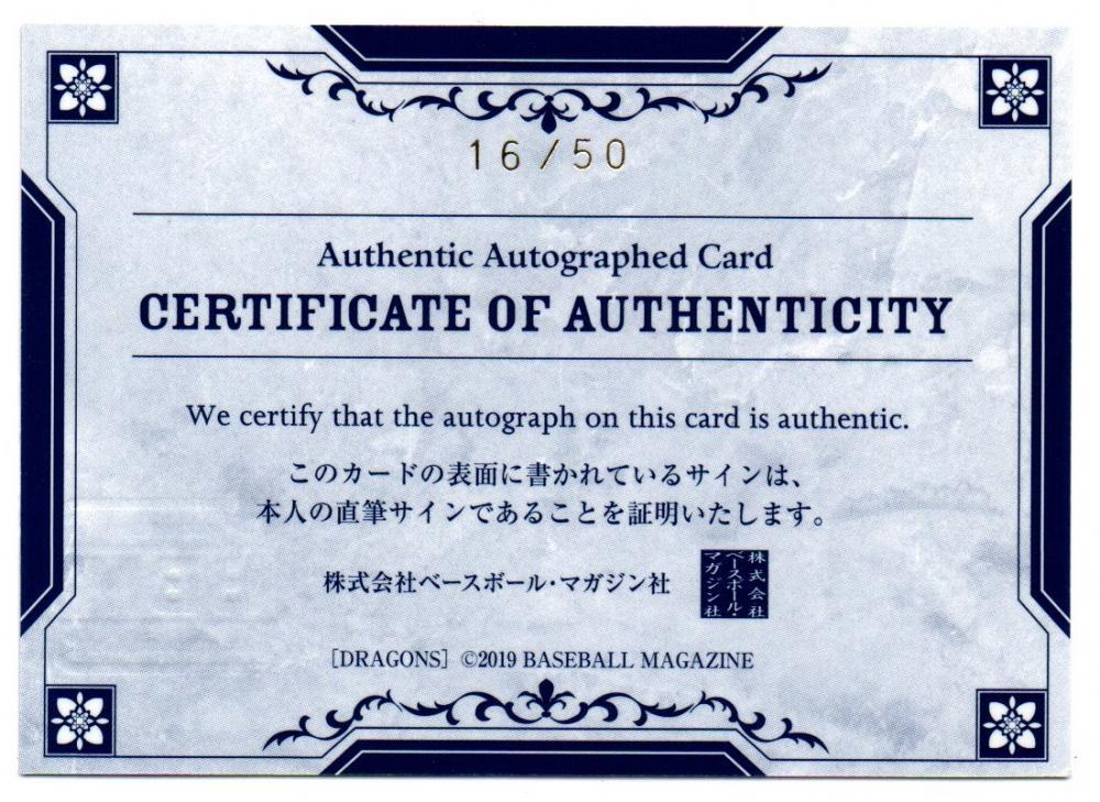 【笠原祥太郎】2019 BBM 中日ドラゴンズ 直筆サインカード[16/50]