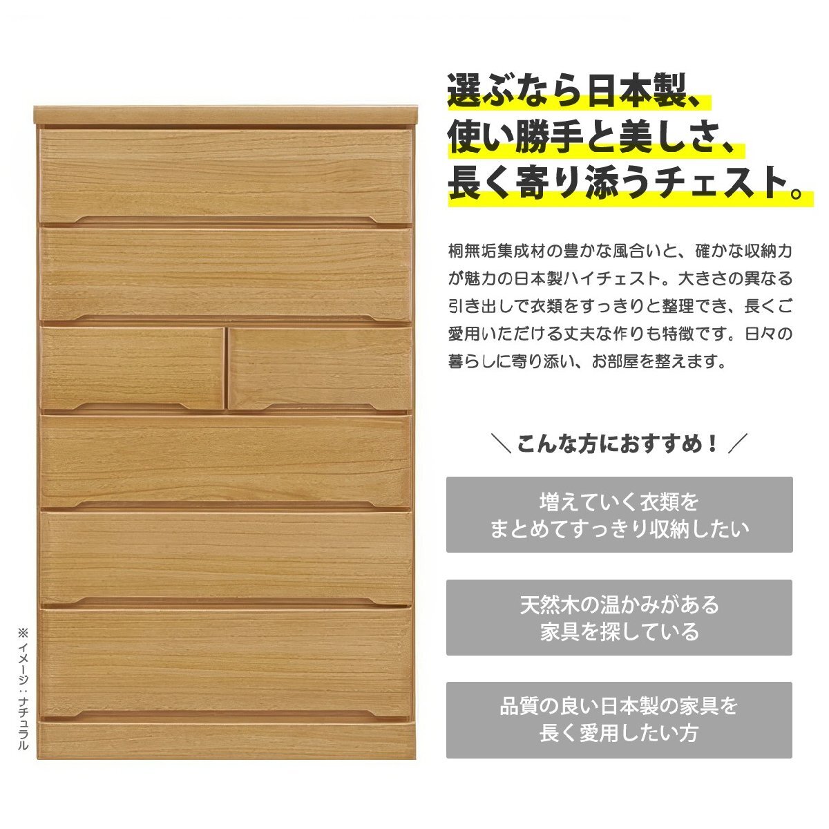 特  徴桐無垢集成材の豊かな風合いと、確かな収納力が魅力の日本製ハイチェスト。