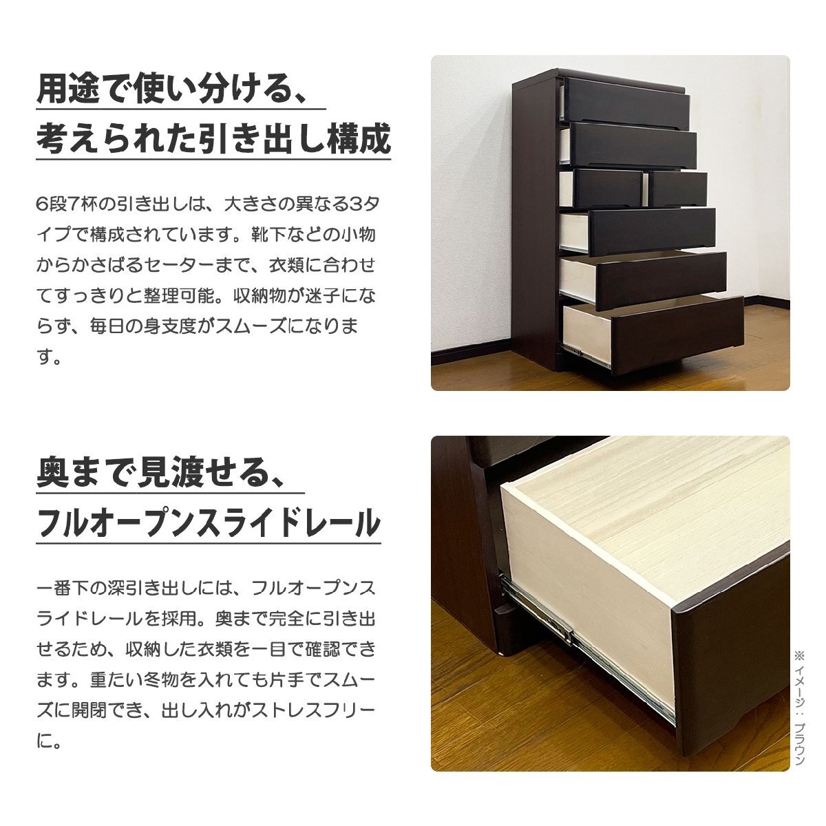 大きさの異なる引き出しで衣類をすっきりと整理でき、長くご愛用いただける丈夫な作りも特徴です。