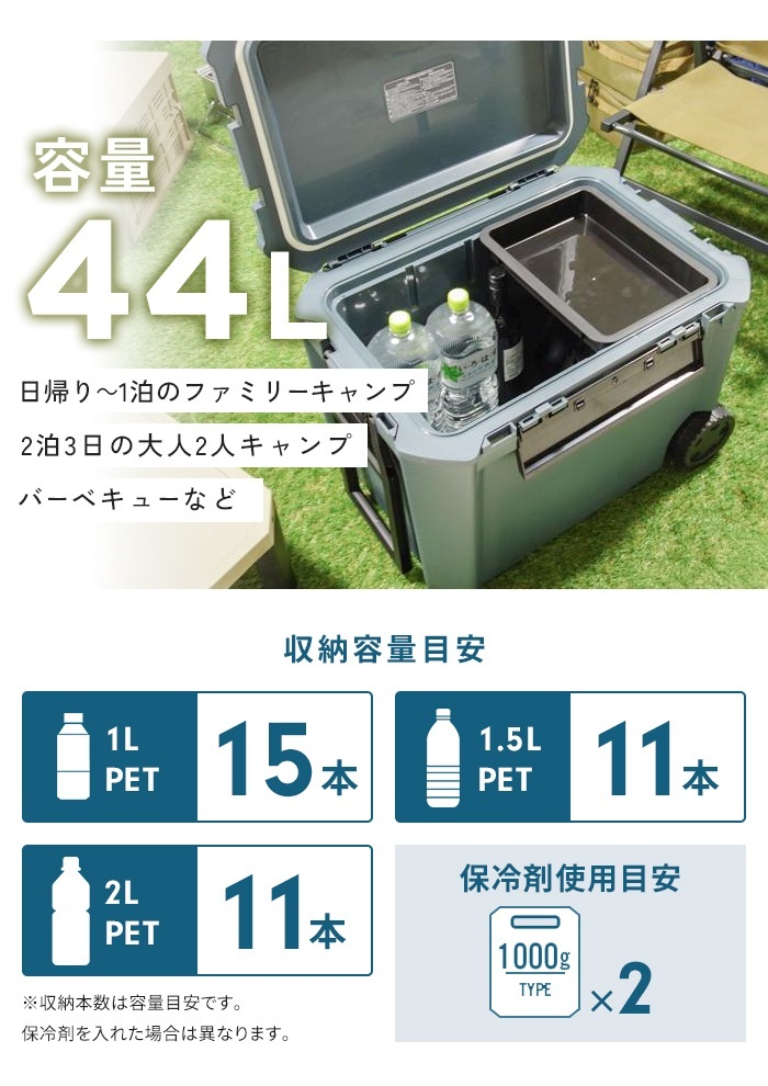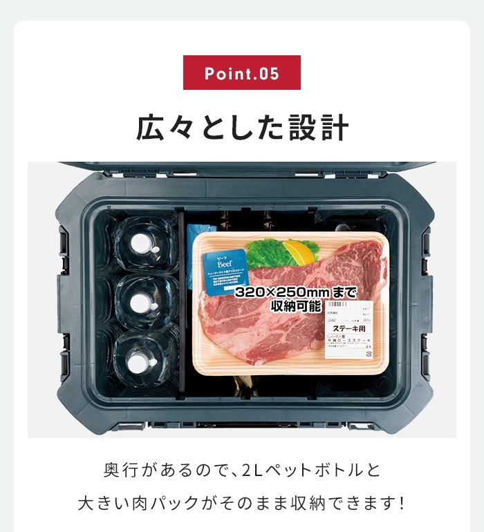 座れるクーラーボックス。 断熱材の厚みが従来品の約2倍で保冷力大幅アップ。 フラットなフタはイスやテーブルとして使用できる強度。 市販の南京錠が取り付けられる鍵穴付き。 ・断熱材厚み約2倍(従来品比較)で保冷力大幅アップ。 ・フタ耐荷重100kgでイスとしても使用可能な強度。 ・フラットなフタ形状でサイドテーブルとしても使用可能。 ・移動が楽な大型キャスター(φ120mm)。 ・積み重ね可能。 ・奥行があるので、大きい肉パック(320×250mmまで)がそのまま収納できます。 ・南京錠がかけられる鍵穴付き。 ・前面幅広1、左右各1の3点バックル仕様で密閉度が向上。 ・左右ハンドル(片側ロングハンドル)。 ・トレーと仕切板が付属。 ・水抜栓付き。 ・用途と収納するものを想定したサイズ展開。 |