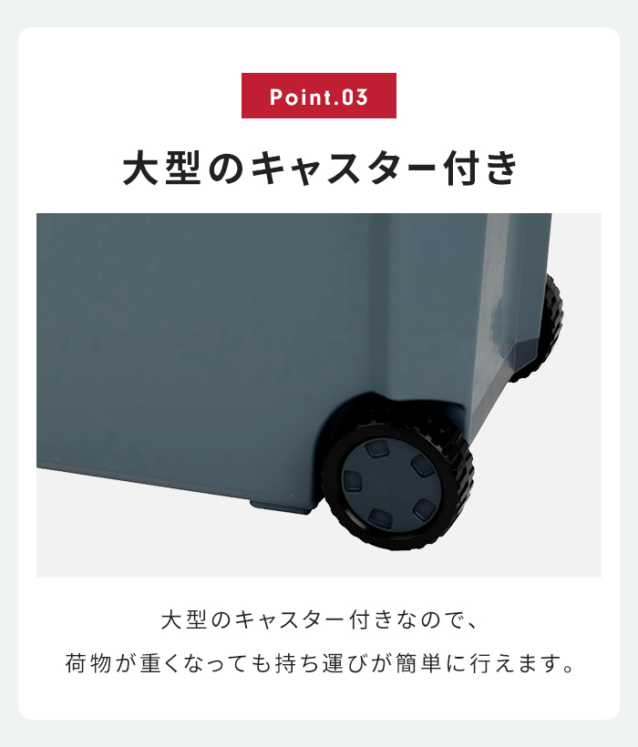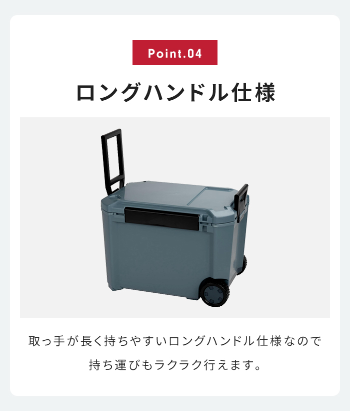 ・座れるフタ耐荷重100kg ・フタの着脱可能 ・積み重ね可能 ・仕切板付き ・トレー付き ・水抜栓付き ・キャスター付き ・氷の残存時間:70時間 ※JIS S 2048 付属書の簡便法による保冷試験方法で測定し、当社独自の方法で氷の残存率が0%になるまでの時間を算出。 |