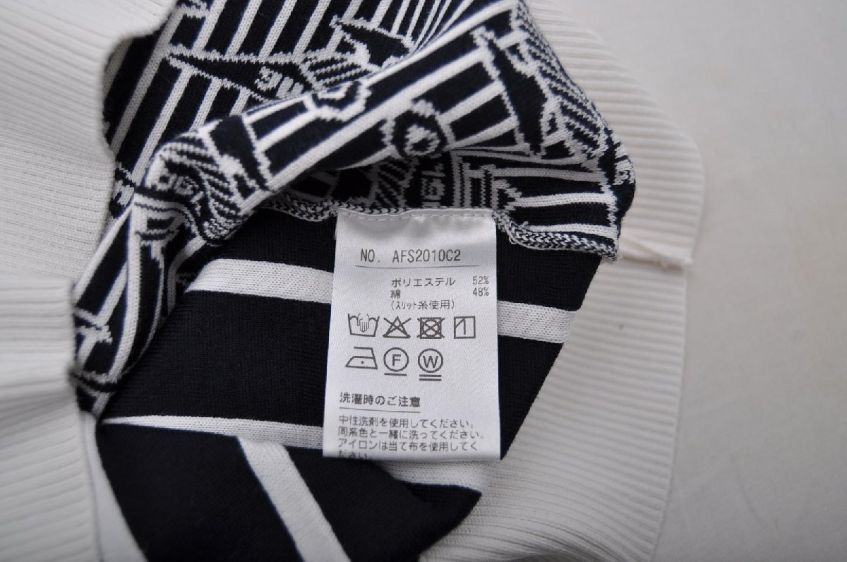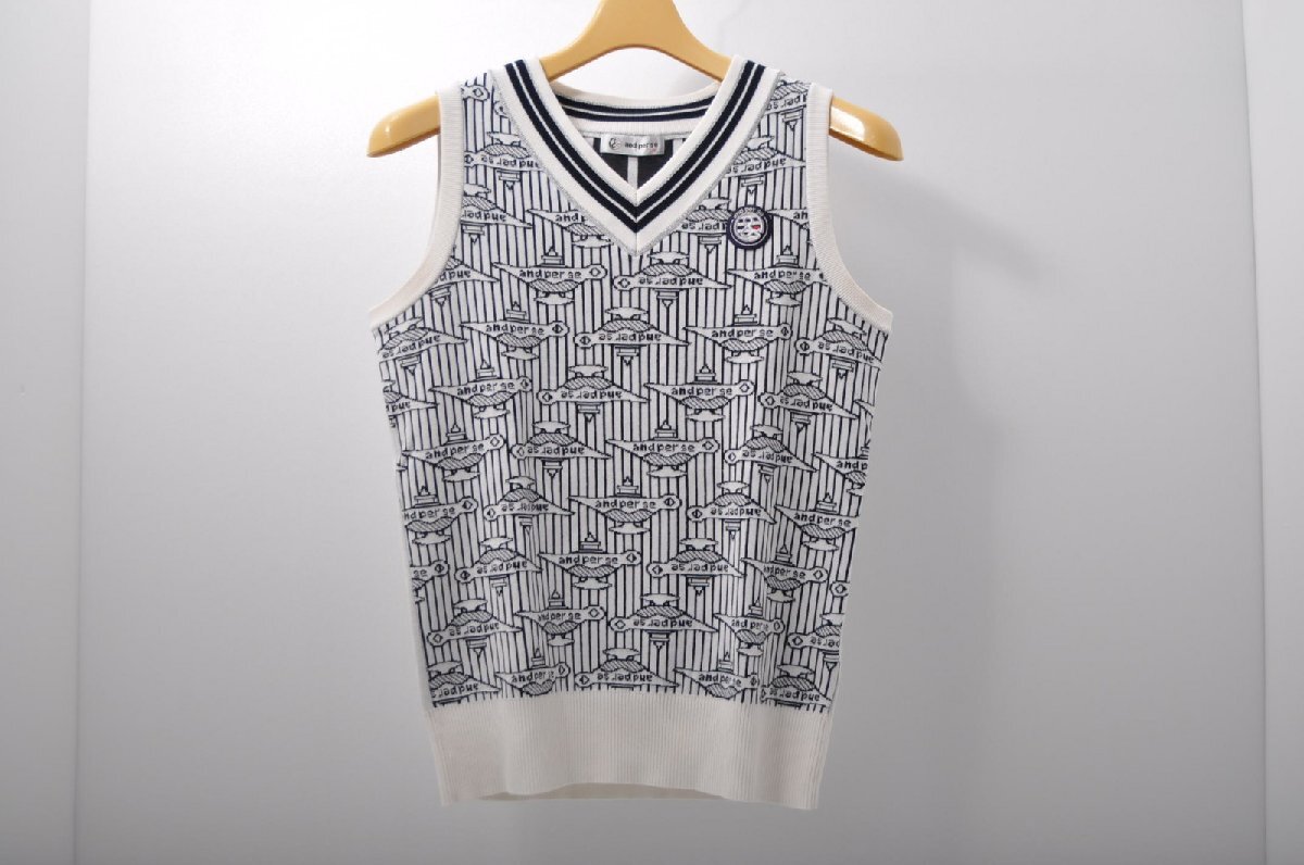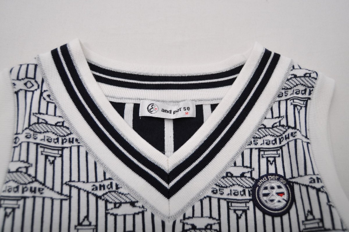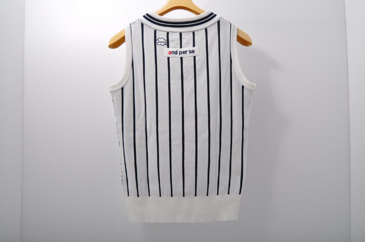 coco 中古【値下げ】 アンパスィ and per se レディース Vネックニットベスト M 白×紺 ストライプ ランプ柄 ネコパケ発送可 85024