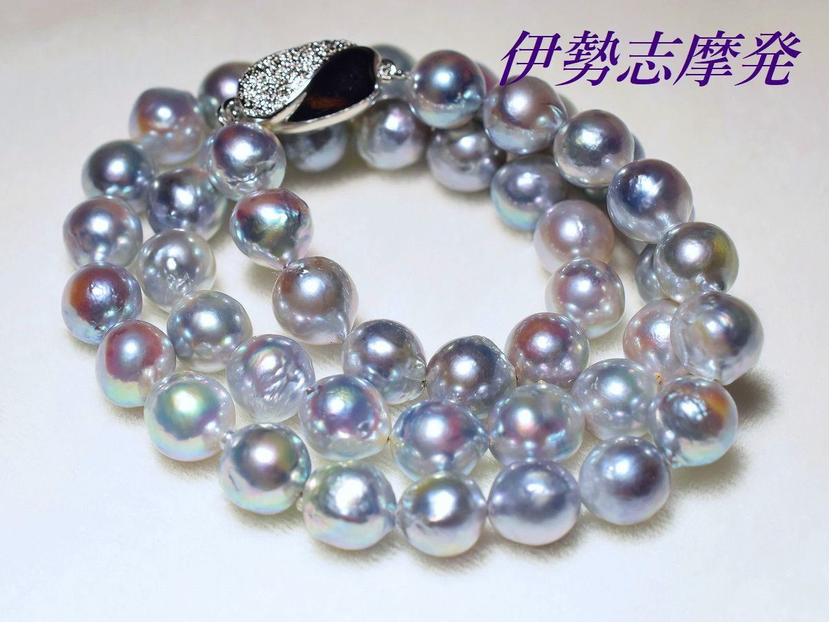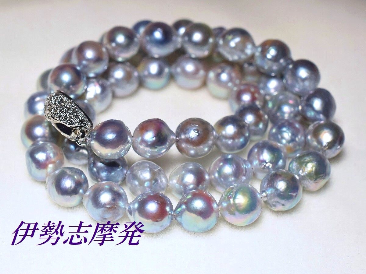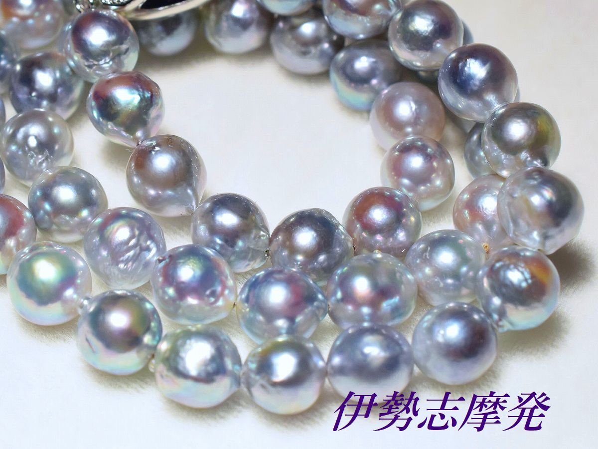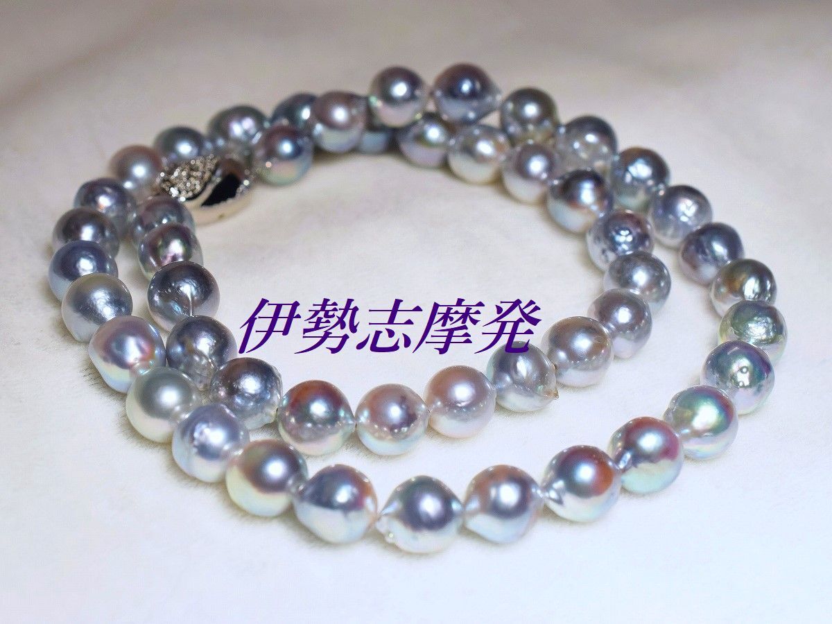 【真珠の種類】 あこやナチュラル真珠 【珠サイズ】 8,4㎜-8㎜平均 【珠の形状】 バロック珠 【色】 ナチュラルブルーの干渉色 【巻き】 非常に良い◎ 【照り】 非常に良い◎ 【キズ】 バロック珠 【エクボ】 バロック珠 【金具の材質】 ロジウムシルバーワンプッシュ 【デザインの大きさなど】 全長43、5cmクラスプ含む ◆このネックレスの魅力は、真珠層の奥から浮かびあがる神秘的な天然カラーと巻きテリの強さです。◆ 真珠層が厚く透き通った空や海の色を連想させる神秘的な色合い、青みを帯びたナチュラルブルーに干渉色のピンクグリーンも・・・ 巻き過ぎから出るバロック珠ですが、その形も二つとして同じものが作れない大変味のあるフォルムです。あこや真珠らしい透明感に浮かび上がる美色は、思わず見惚れてしまう魅力のカラーです。 大変上品な色合いなので冠婚葬祭は勿論の事、一本あると色んなシーンでお役立ていただけます。例えばビジネススーツのダークカラー等と合わせることでブルーの神秘的な色合いが一層際立ち、より美しく見えます。 バロック珠なので瑕や膨らみなど混ざりますが、其れにも増して真珠層の奥から浮かび上がる神秘的な色合いと、強い巻きテリの独特な存在感に魅了される事でしょう。遠く離れた場所からでもその存在感は半端じゃありません 着け外しも簡単に行なえる、しっかしっかりとした作りのワンプッシュクラスプ仕上げです。 | ||||||||