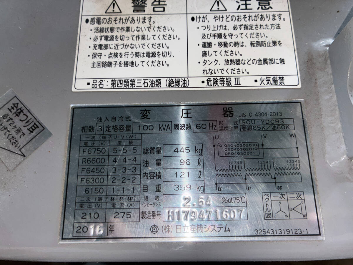 中古品 (株)日立産機システム 三相 動力 変圧器 100KVA トランス 6600V-210V 2016年製 SOU-YDCR 445kg 60HZ  になります。