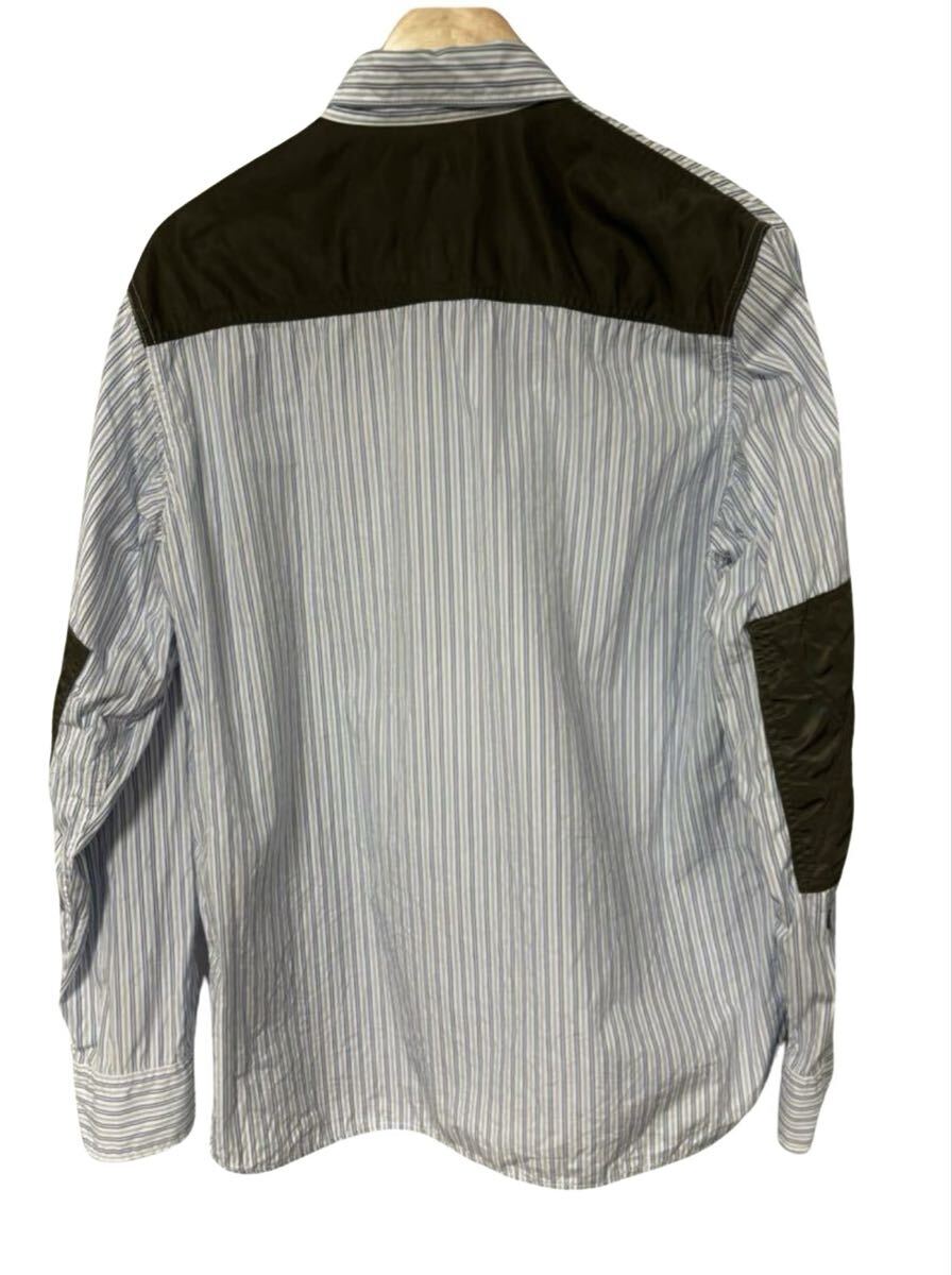 全体はクラシックなブルーのストライプ柄で仕上げつつ、ナイロンの異素材切り替えがアクセントとして効いており、シンプルな中にも確かな存在感。伝統的なシャツの上品さと、スポーティで軽快な印象を絶妙なバランスで両立しています。