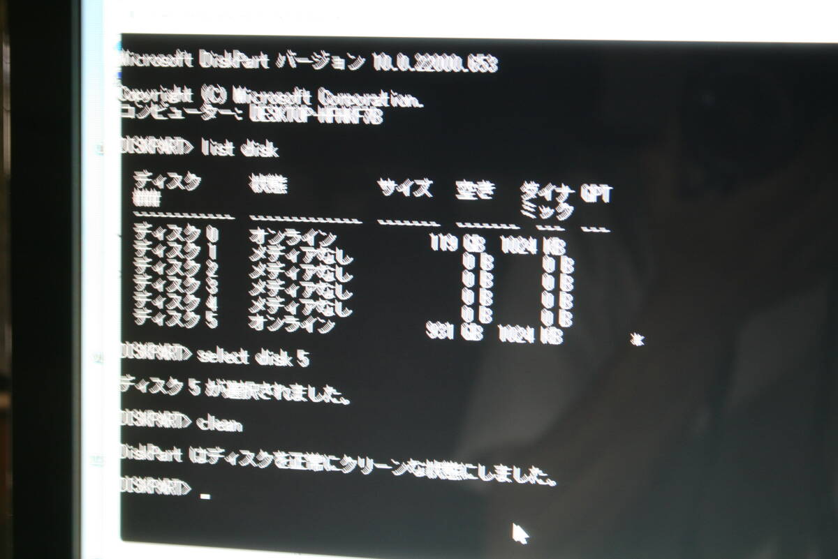 Microsoft Disk Part Clean完了(フォーマット以前の状態に戻してあります)。