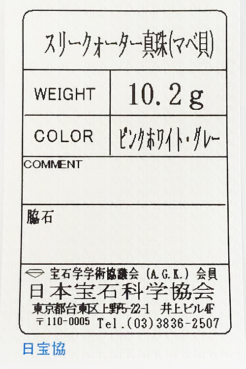 ■マベ真珠 | 色 : ピンクを帯びたクリームホワイトの色合い エクボ・傷 : 特有の凹凸があり、目立たない程度の表面傷を確認できる 形・テリ : やや歪な円形に近い、テリの良い珠 |