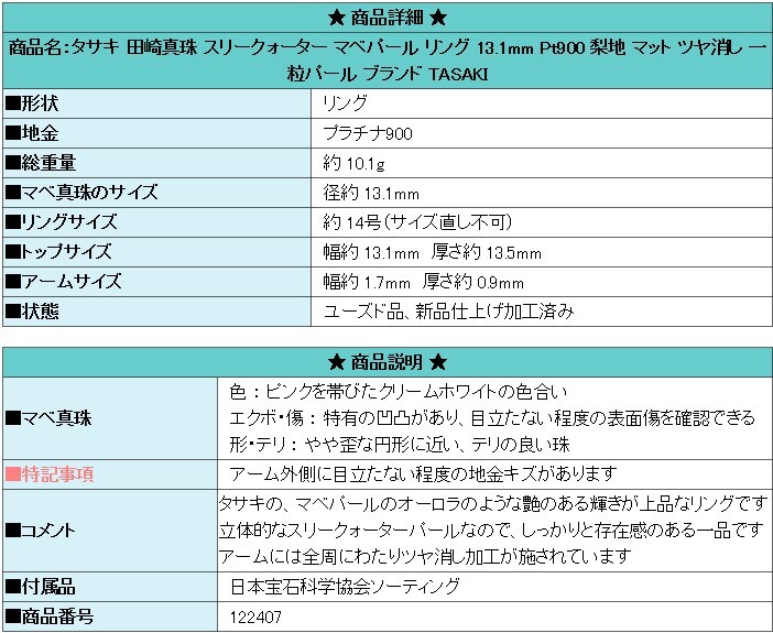 商品名:タサキ 田崎真珠 スリークォーター マベパール リング 13.1mm Pt900 梨地 マット ツヤ消し 一粒パール ブランド TASAKI | |