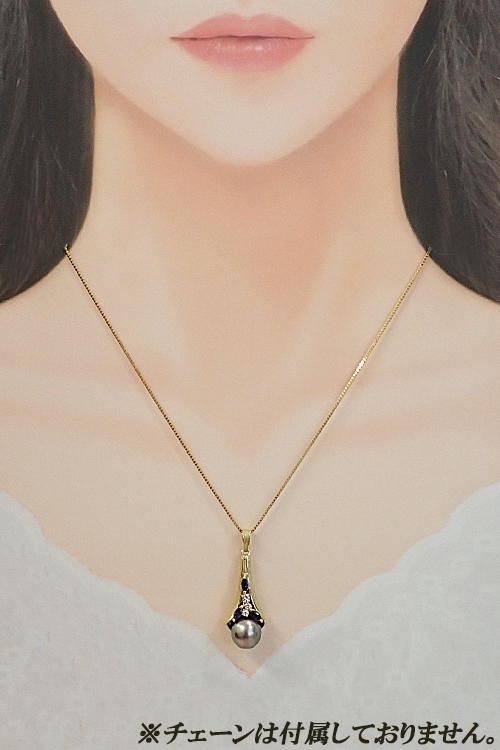 商品名クイーン 黒蝶真珠(南洋真珠) ペンダントトップ ダイヤモンド サファイア K18イエローゴールド Queen 梨地 ツヤ消し マット