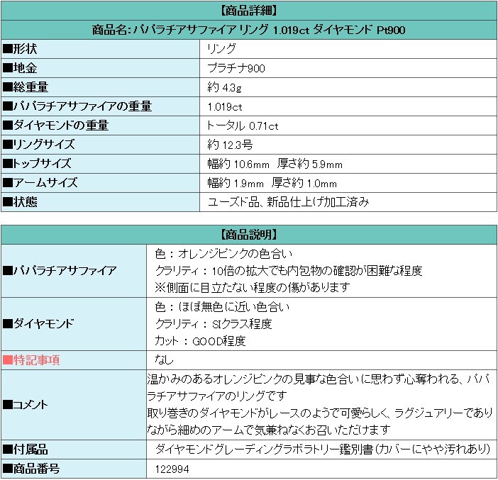 商品名:パパラチアサファイア リング 1.019ct ダイヤモンド Pt900 | |