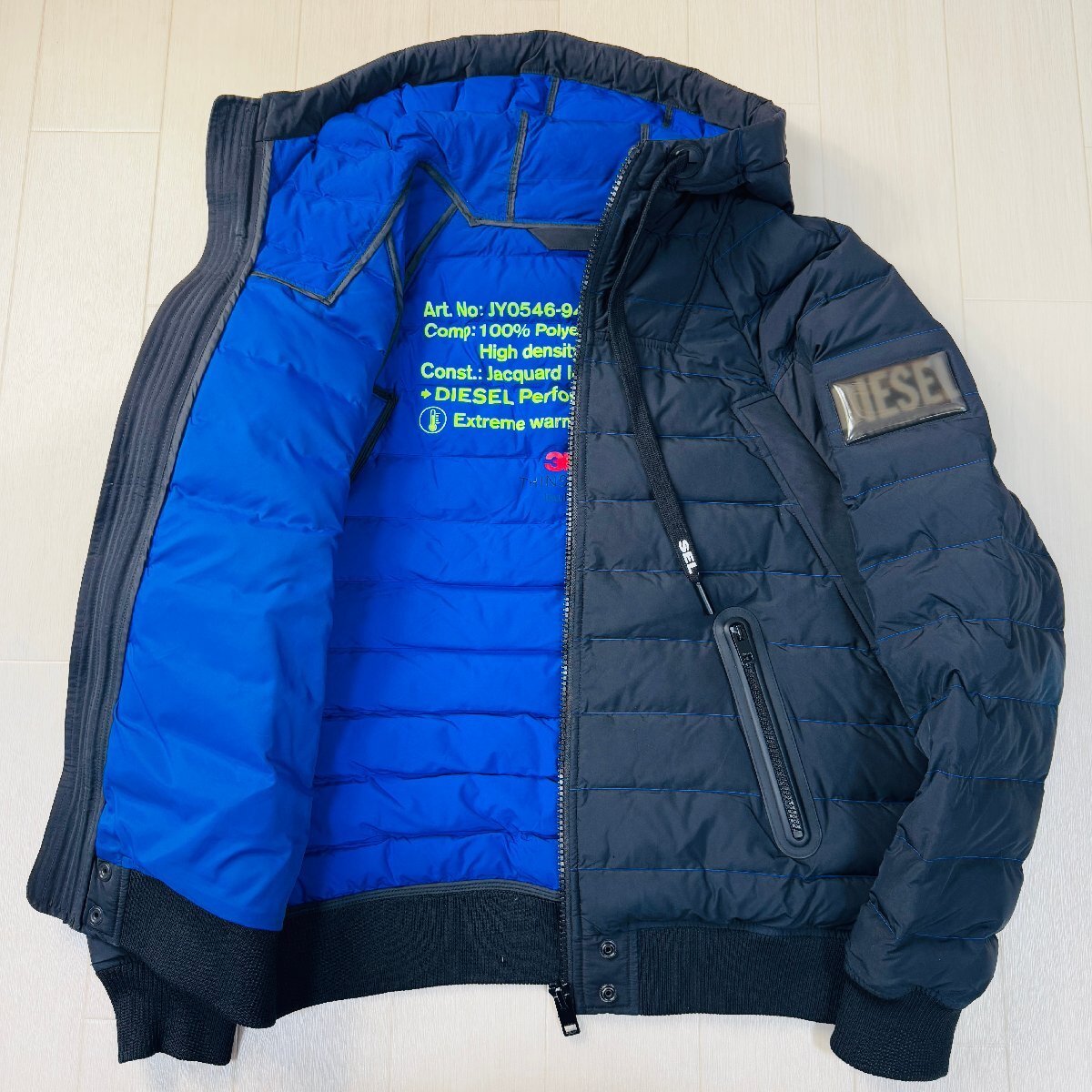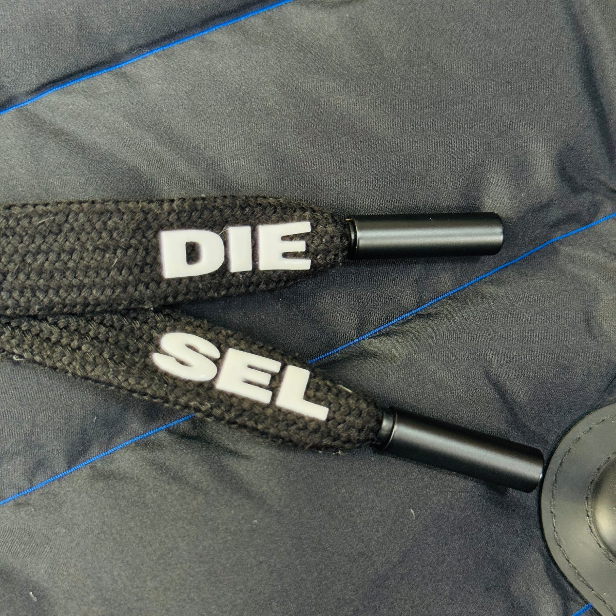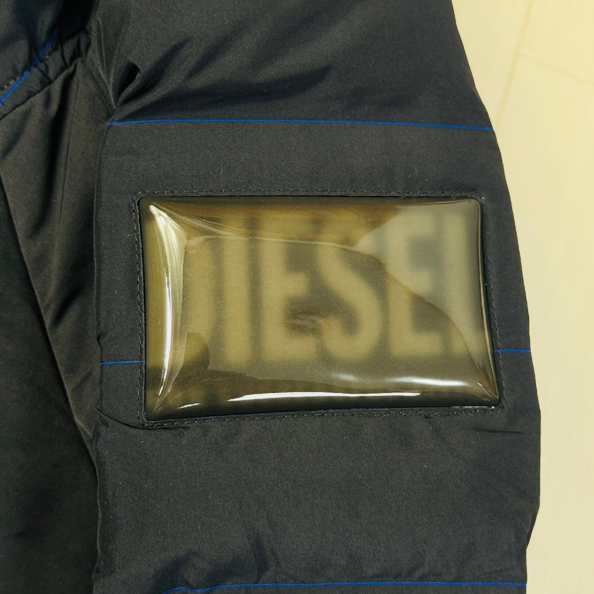 美品/L~相当★ディーゼル/DIESEL 袖ロゴプレート パディング フーデット ジャケット パーカー 中綿 青ステッチ バイカラー メンズ 黒