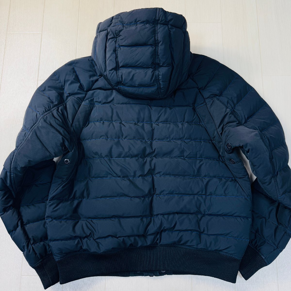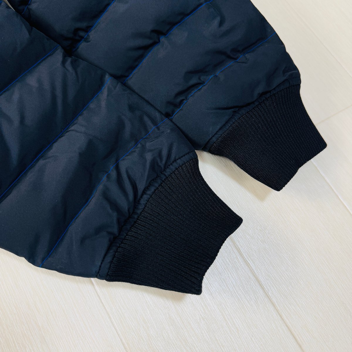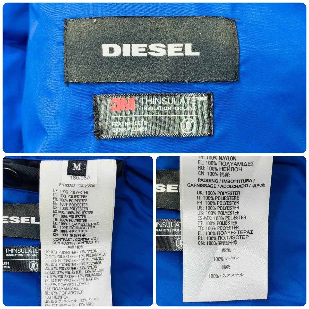 美品/L~相当★ディーゼル/DIESEL 袖ロゴプレート パディング フーデット ジャケット パーカー 中綿 青ステッチ バイカラー メンズ 黒