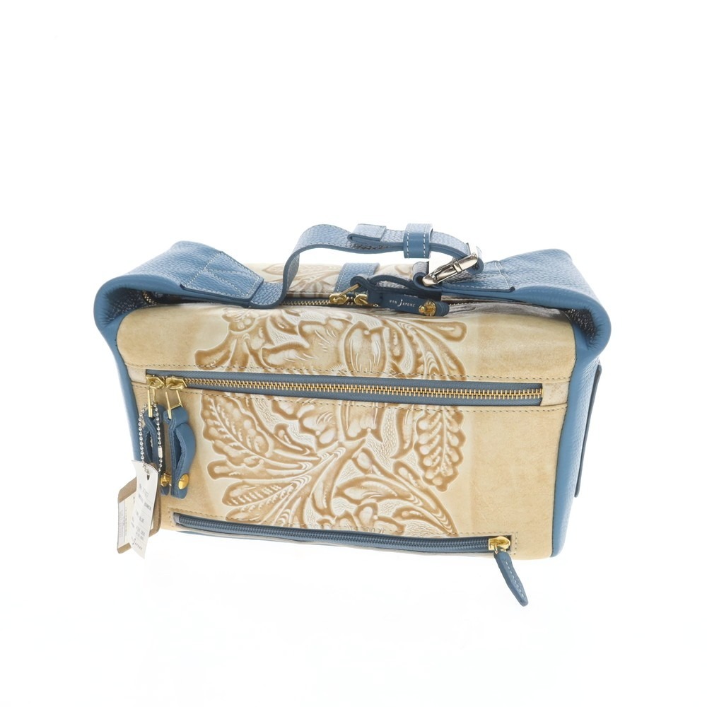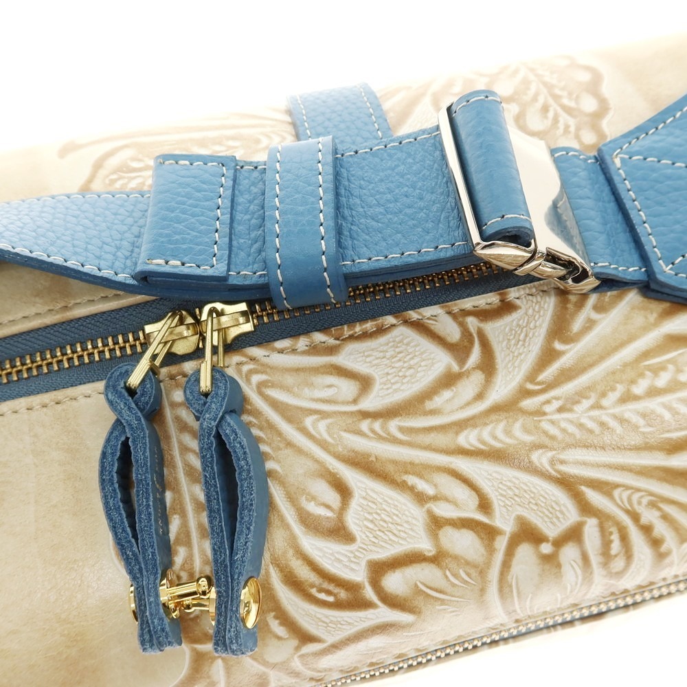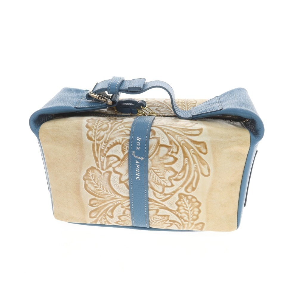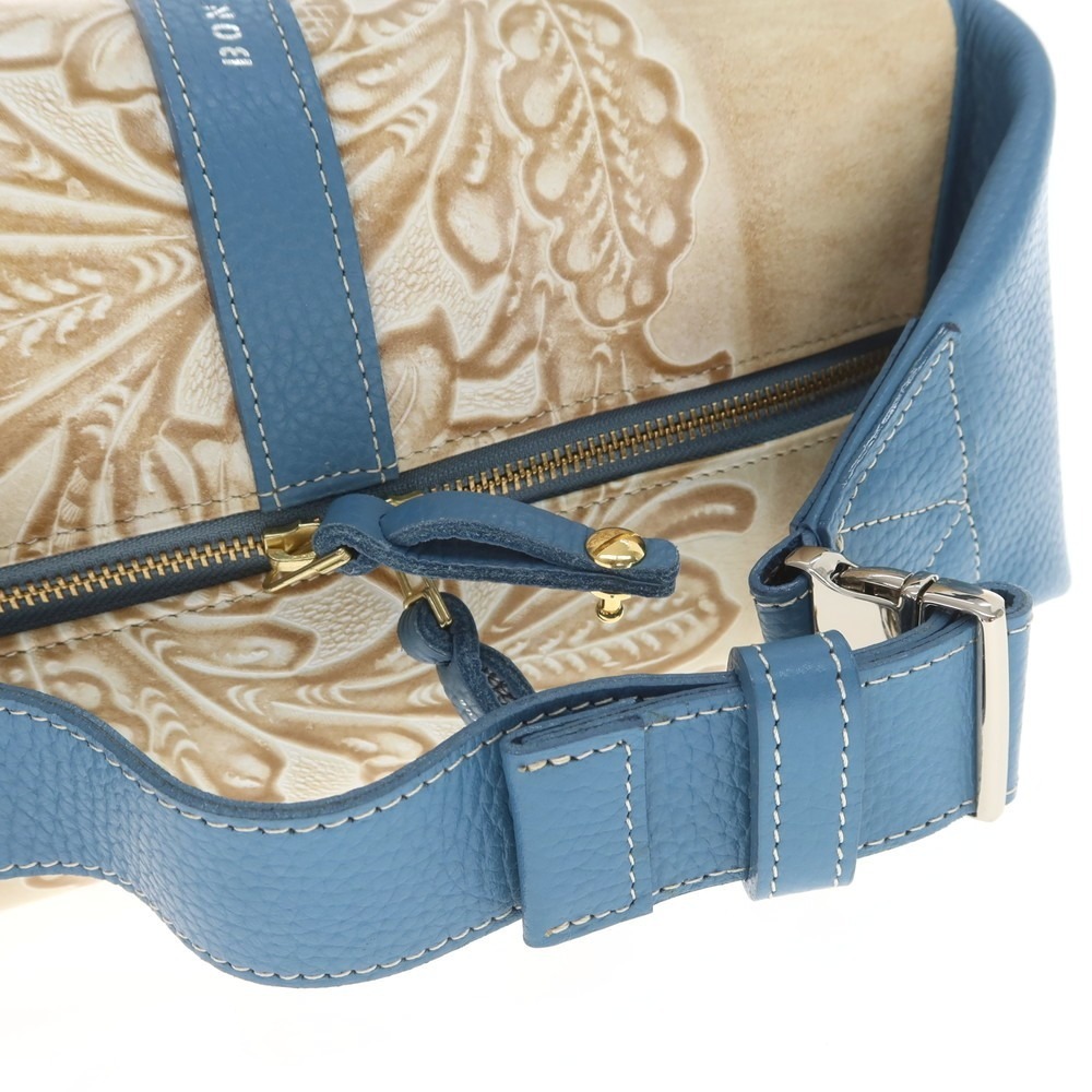 【未使用】ボンジャポネ BONJAPONE カービングレザー ハンドバッグ ブルーxライトベージュ【WxH14.5】 BPD