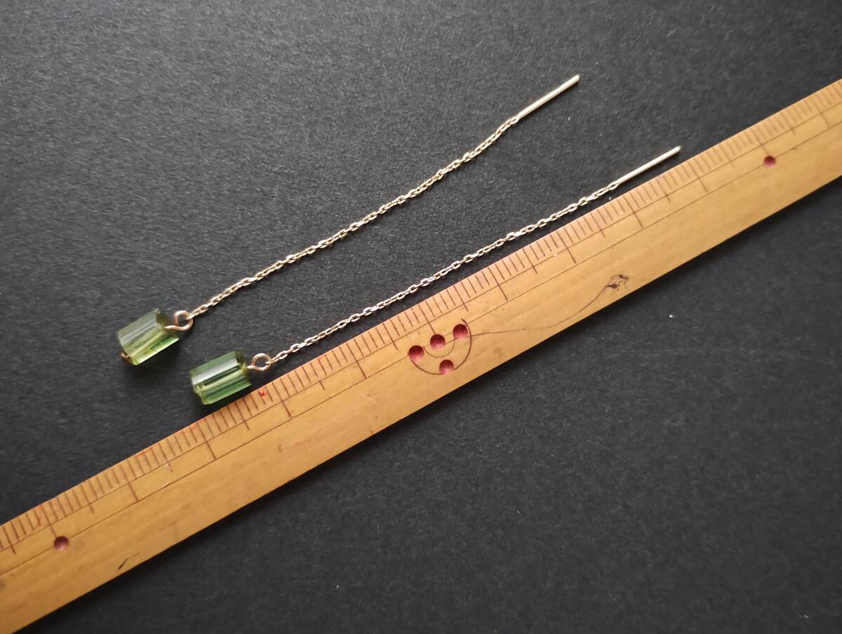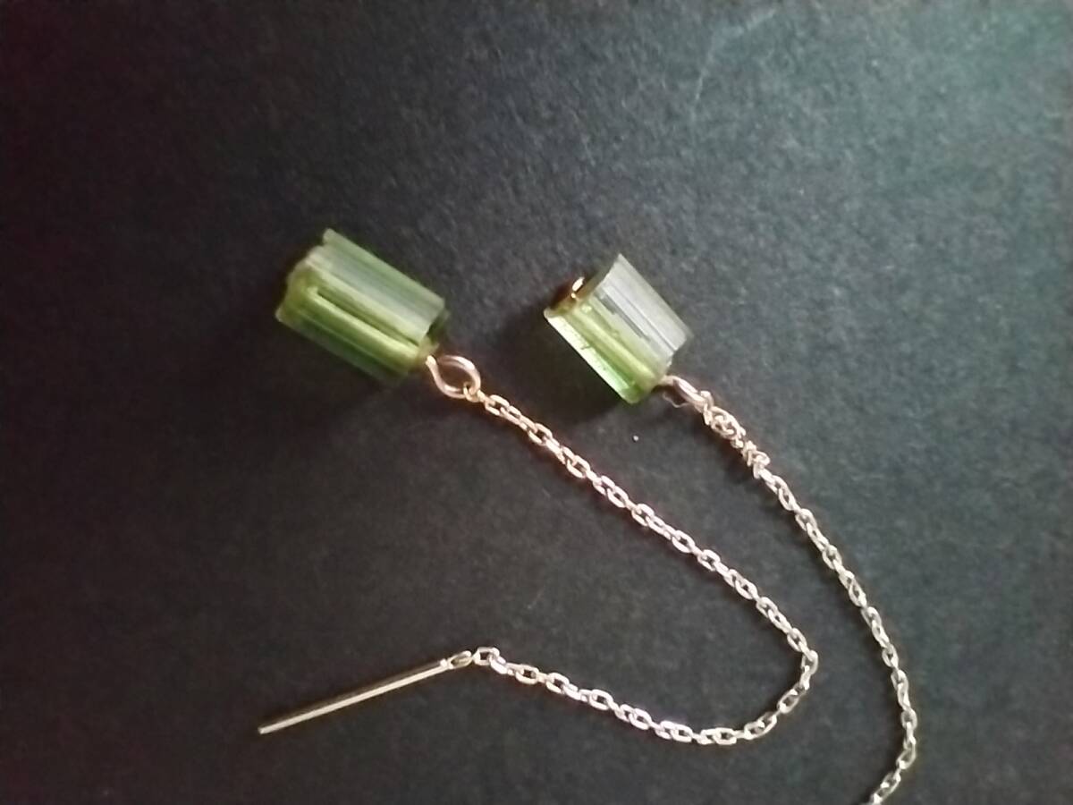 グリーントルマリンの円柱型の結晶をそのまま生かしたピアス。
