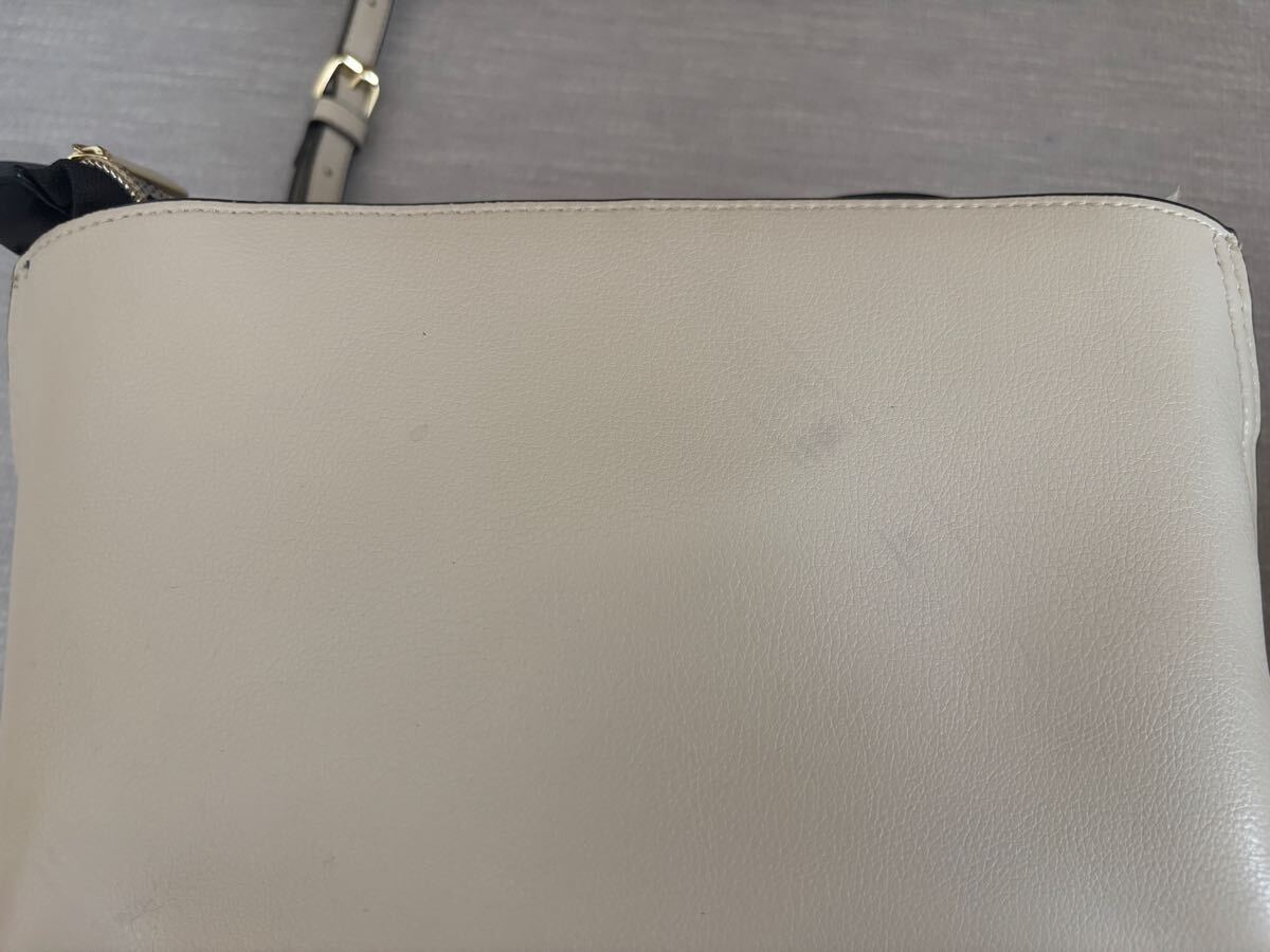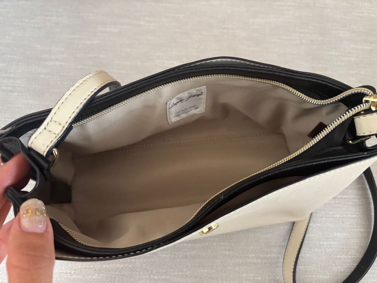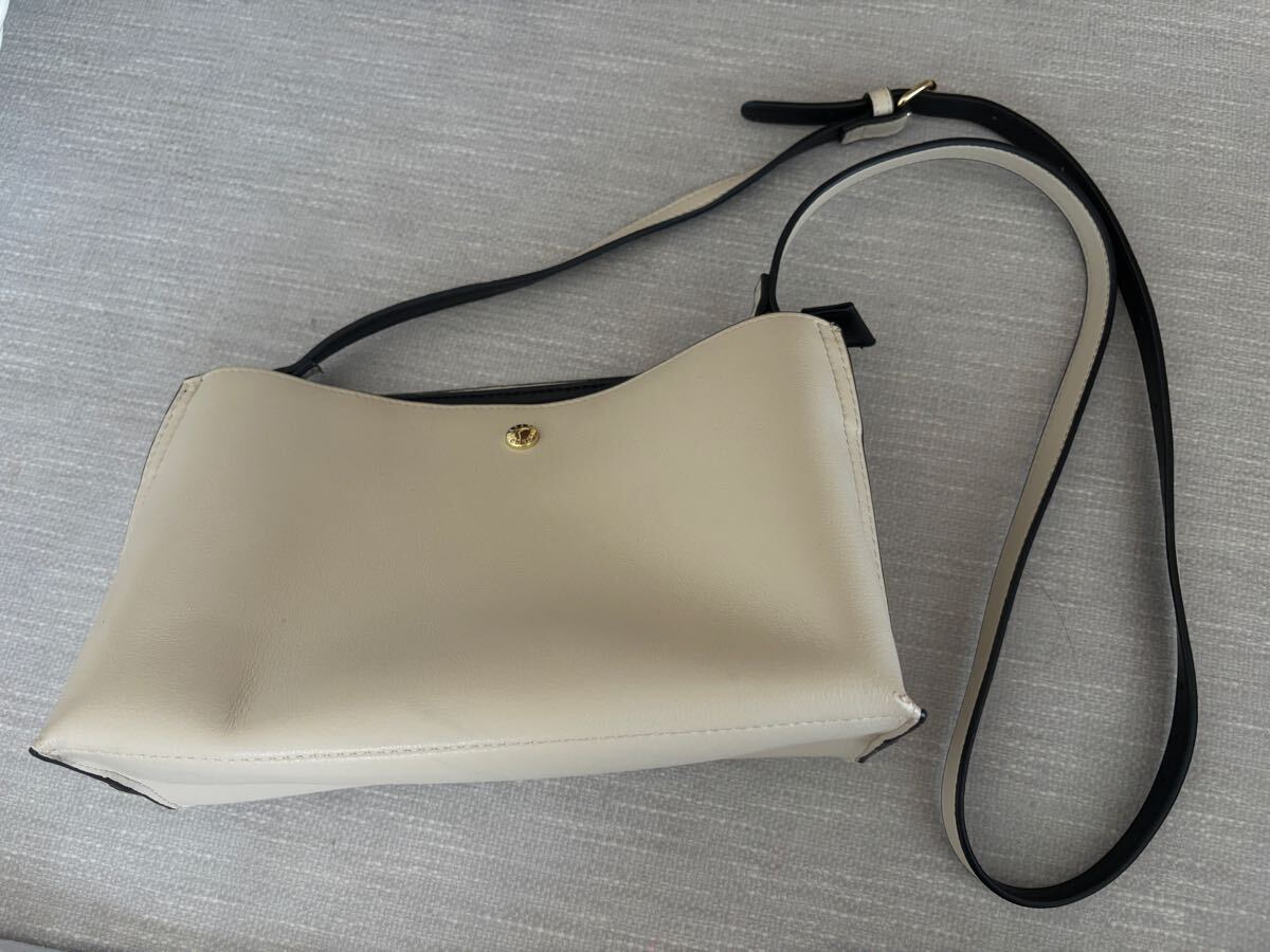 クリーム色の合成皮革製ショルダーバッグ、調整可能なストラップとジッパー開閉。
