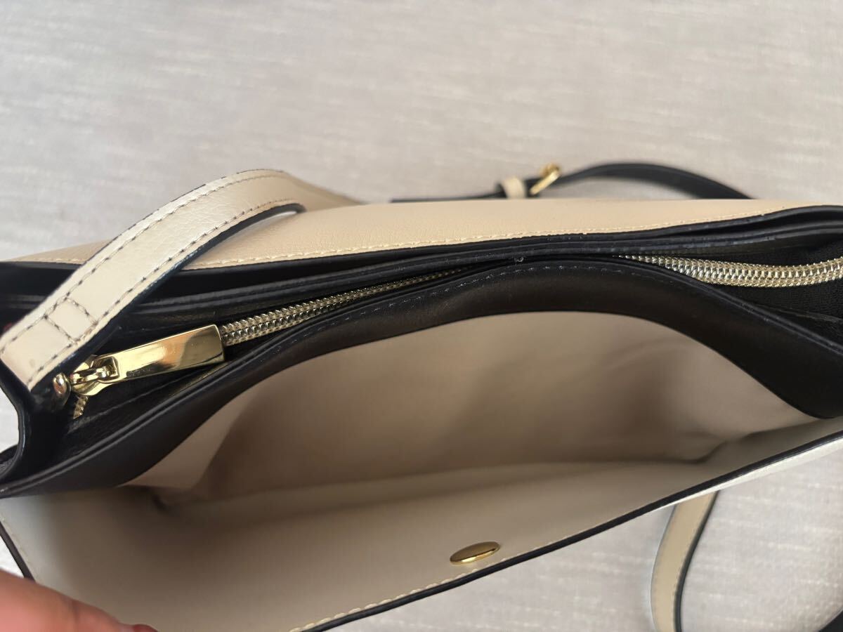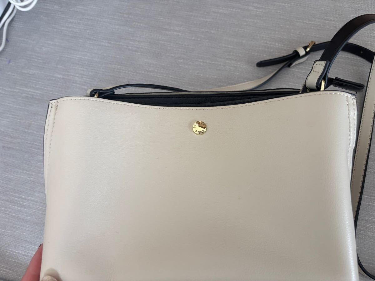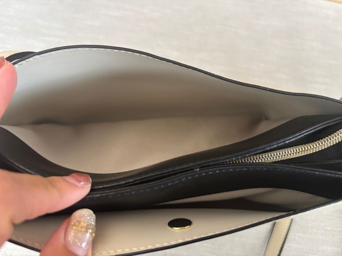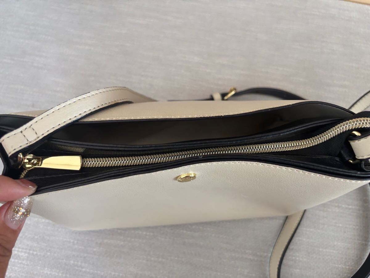 クリーム色の合成皮革製ショルダーバッグ、調整可能なストラップとジッパー開閉。