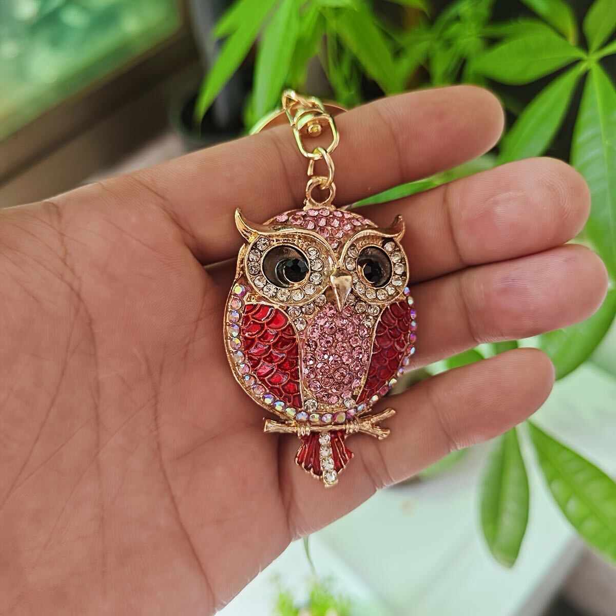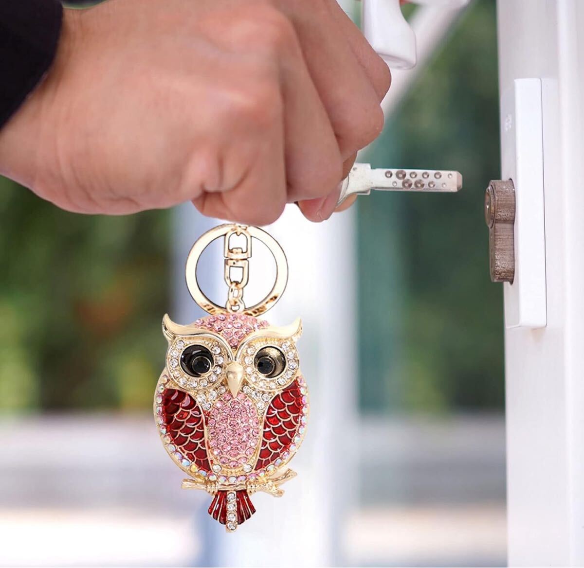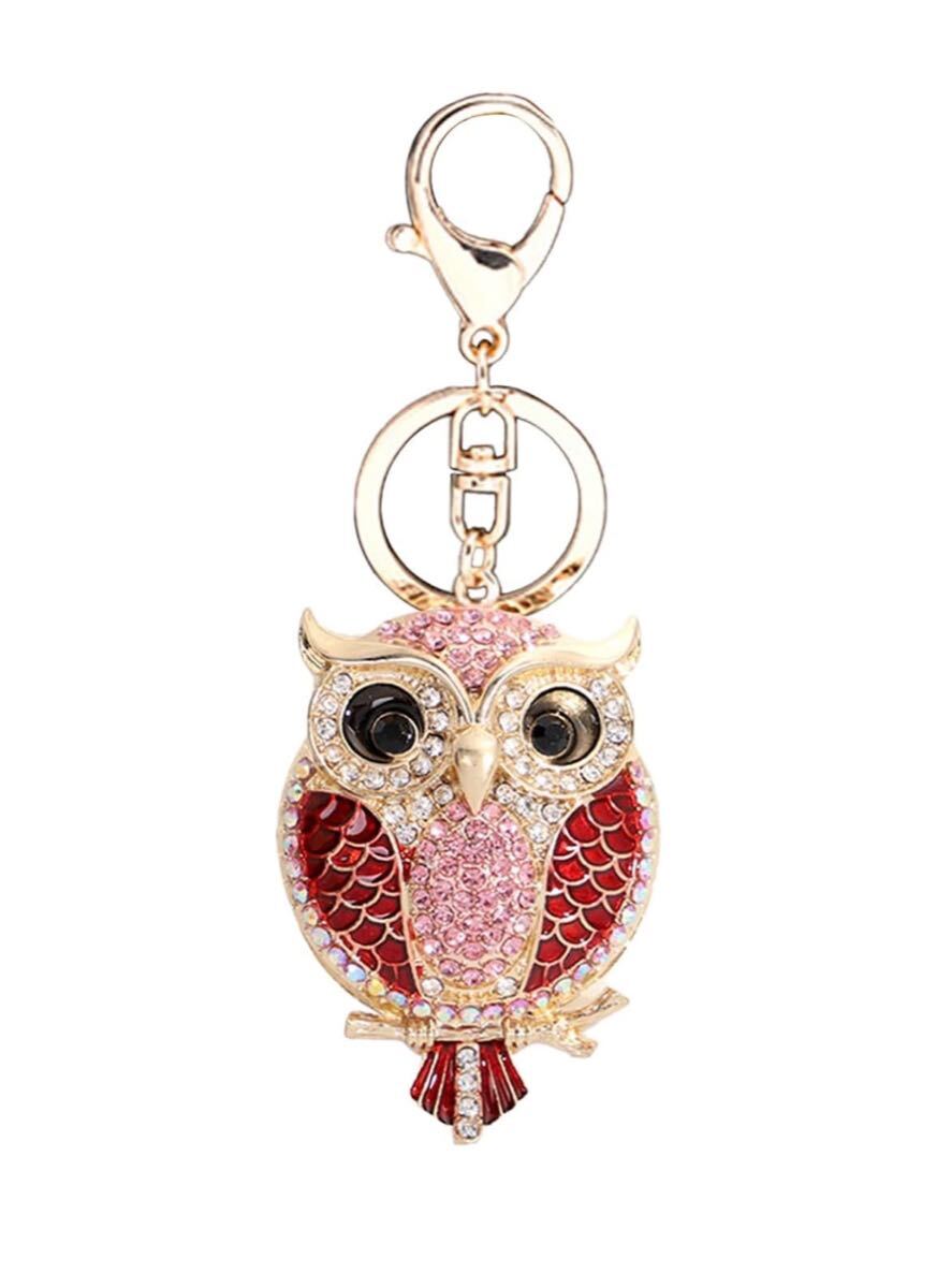 存在感のあるキラキラのラインストーンがついたフクロウのチャーム付きキーホルダーです。