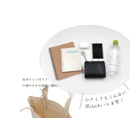 財布、スマホ、化粧品で丁度良いサイズ。お弁当入れにも良いですね。
