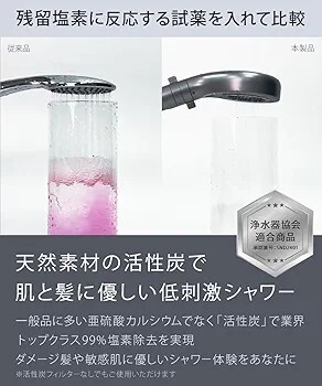 塩素除去に化学物質でなく、髪、肌、頭皮に優しい天然素材の活性炭を使用。お子さんへのご使用やお肌のお悩みをお持ちの方も安心の低刺激シャワーを実現※フィルターなしでもナノバブルはご使用いただけます
