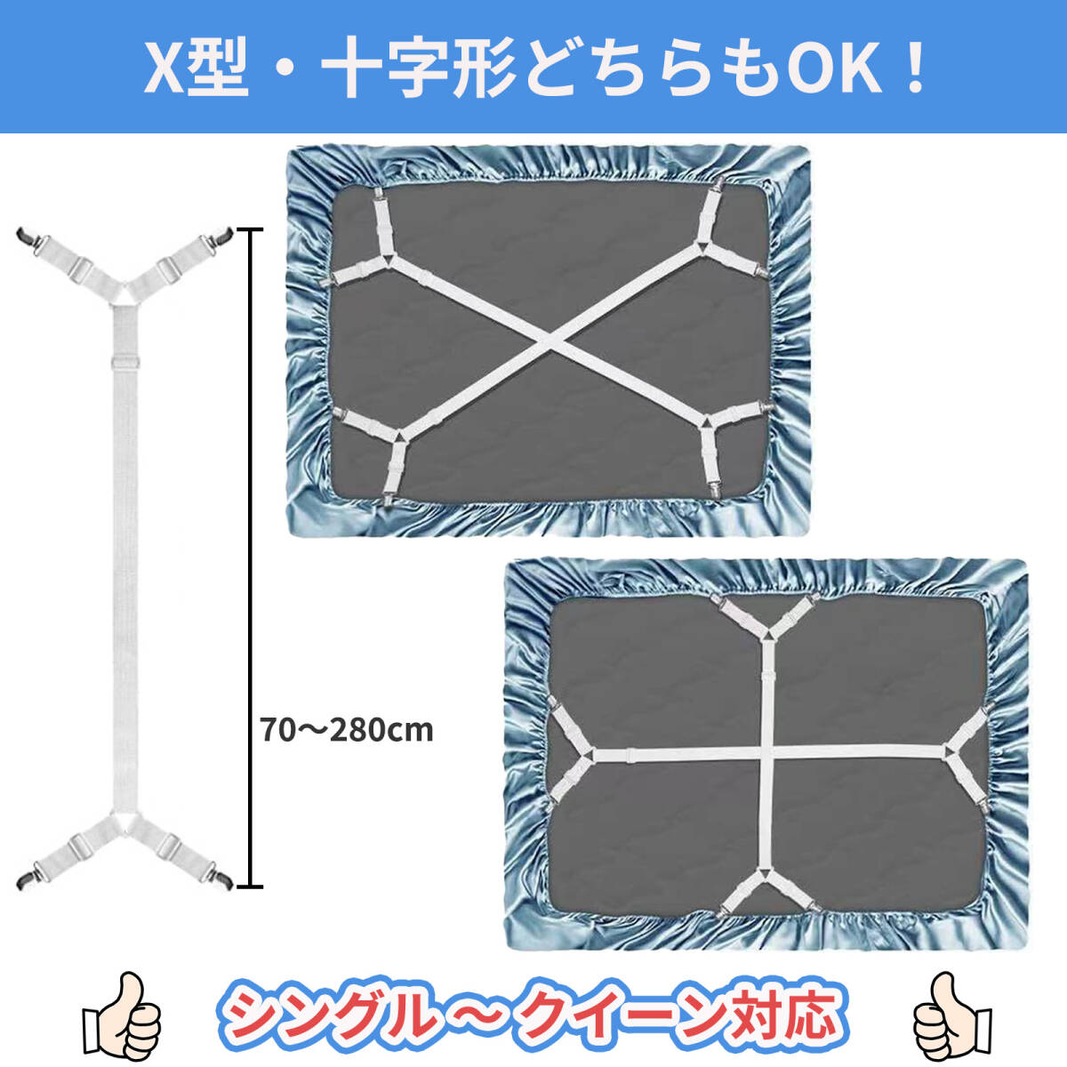 • シーツのズレを防ぐ布団クリップ2個セットです。最大280cmまで伸びる調整バンドで、シングル・ダブル・クイーンなど様々なサイズのベッドに対応。クロス型や十字型に設置でき、寝返りでシーツがずれるのを防ぎます。