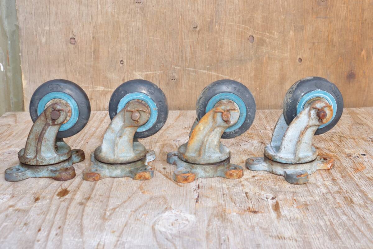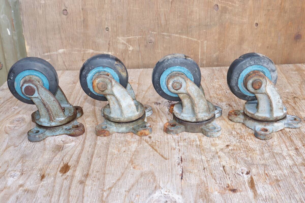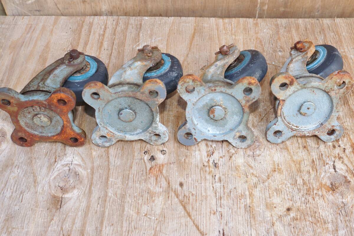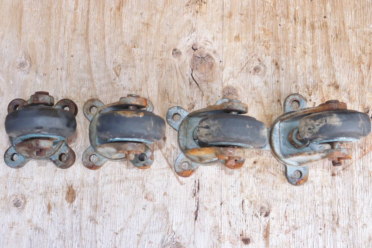 商品説明 | サイズ等はタイトルや画像、コメントを併せて参照してください。 (サイズや重量は概略です。) 高さ120㎜ 車輪 直径75㎜ 幅32㎜ 【中古品】台車取り外し品 *長く保管されていた木製台車から取り外しました。 |