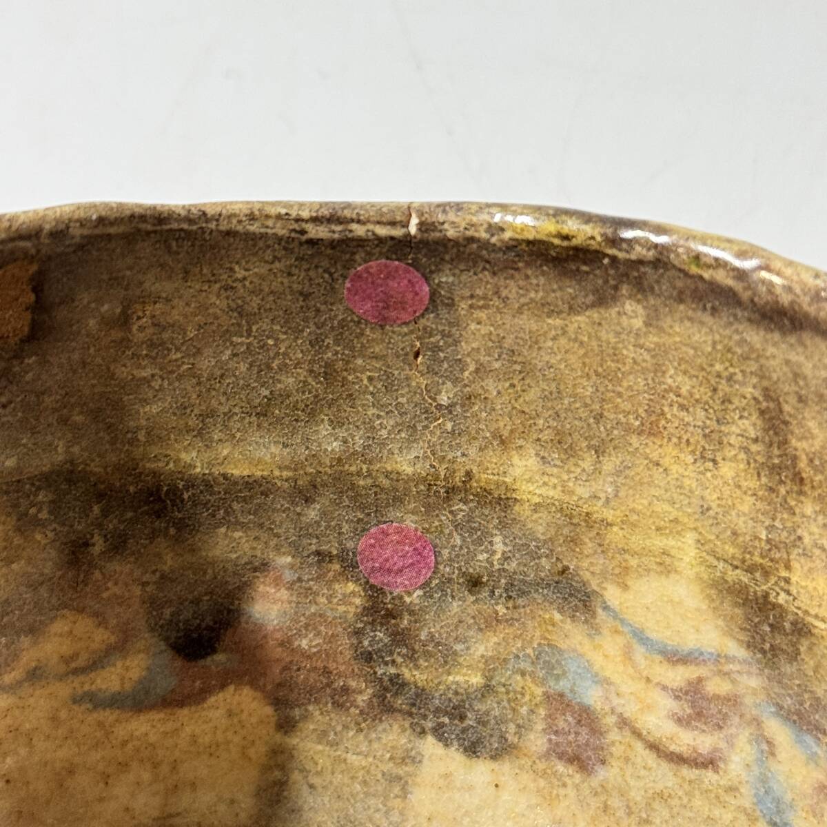 状態は画像でも確認いただけるかと思いますが、ひびが入っている箇所が見られ、高台の中央に記名が見られるため難在りとしました。(画像6.8.9.10参照)※外側と内側のヒビの箇所にマスキングシールを貼っています。