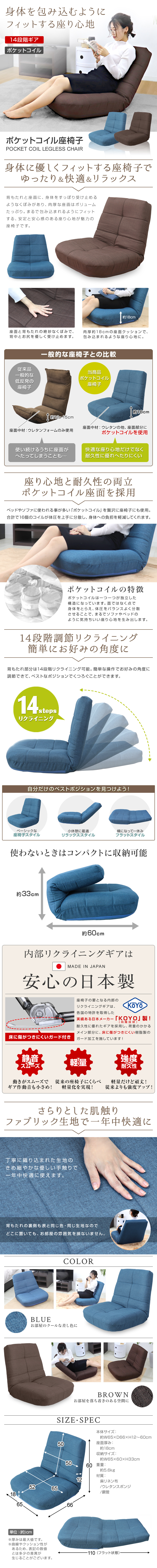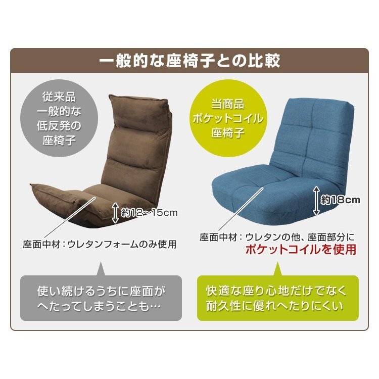 体に優しくフィットする座椅子です。 背もたれと座面に体をすっぽり受け止めるくぼみがあり、まるで包み込まれるような座り心地。 座面中材にポケットコイルを使用しているので、快適な座り心地だけでなく通常の座椅子よりも耐久性に優れへたりにくいのが特徴。 16個のコイルが体圧を上手に分散し、体への負担を軽減してくれます。 大事な内部ギアは、世界でも活躍する実績ある日本メーカー「KoYo」の日本製! 14段階リクライニングで、曲げて、伸ばして、広げて・・・くつろぎ方、選び放題です♪ 使用シーンに合わせて、好みの角度に調整ができます。 【商品仕様】 カラー:ブラウン サイズ:(約)幅65x奥行66x高さ12〜60cm 座面厚み:(約)18cm 収納サイズ:(約)幅65x奥行60x高さ33cm 重量:(約)5.6kg 素材:麻リネン布、ウレタンスポンジ、鋼管 【注意事項】 ・この商品はカバーリングではありません。(洗濯不可) ・生産ロッドが違う場合、柄/色味が若干変わってくる場合がございます。 ・商品を使用して発生した事故/トラブル/破損等につきましては一切の責任を負いかねます。 |