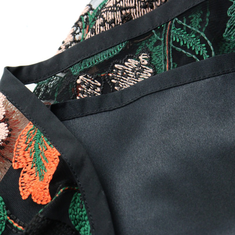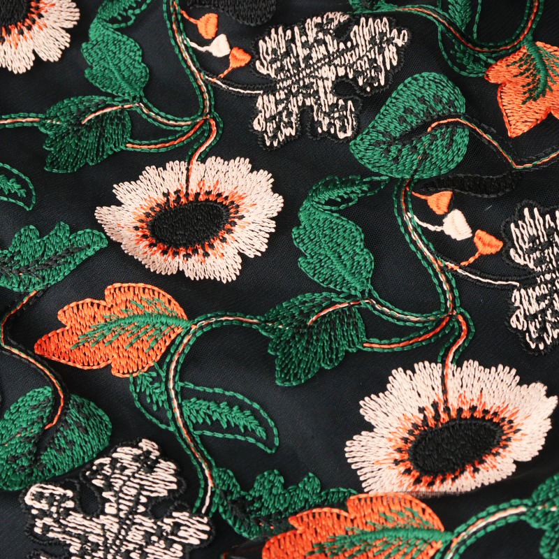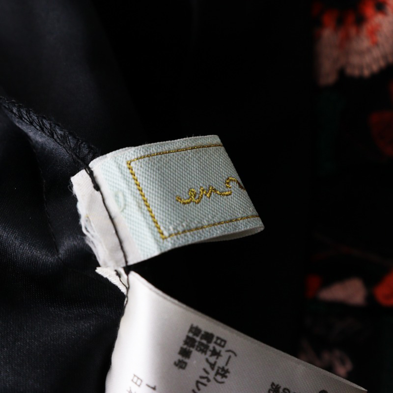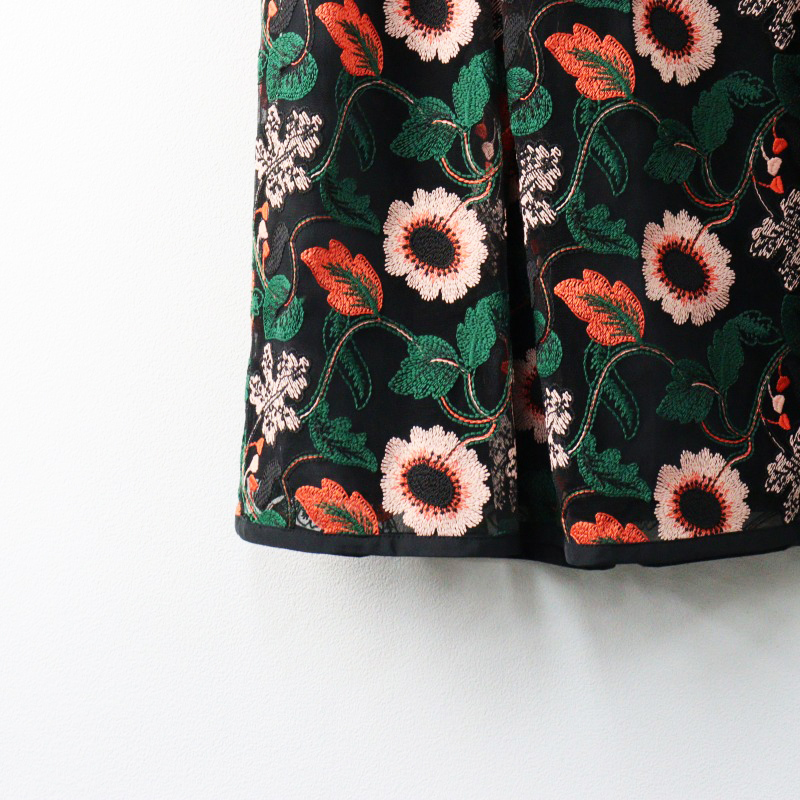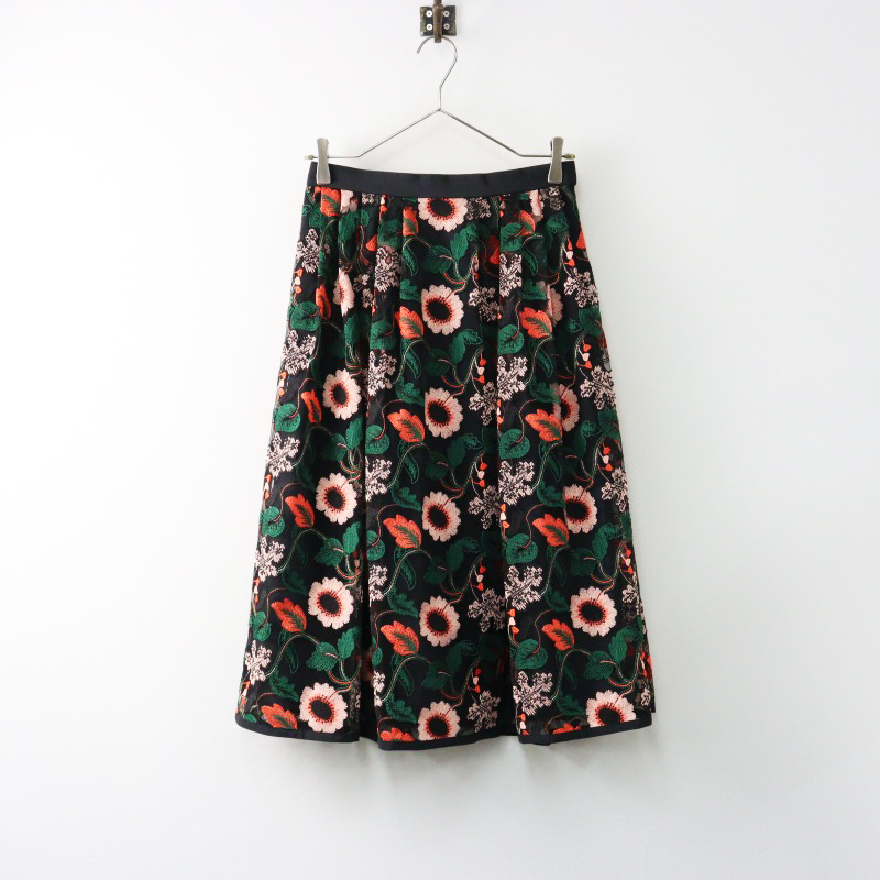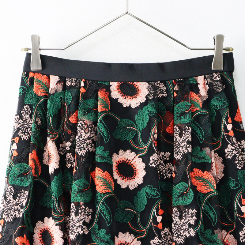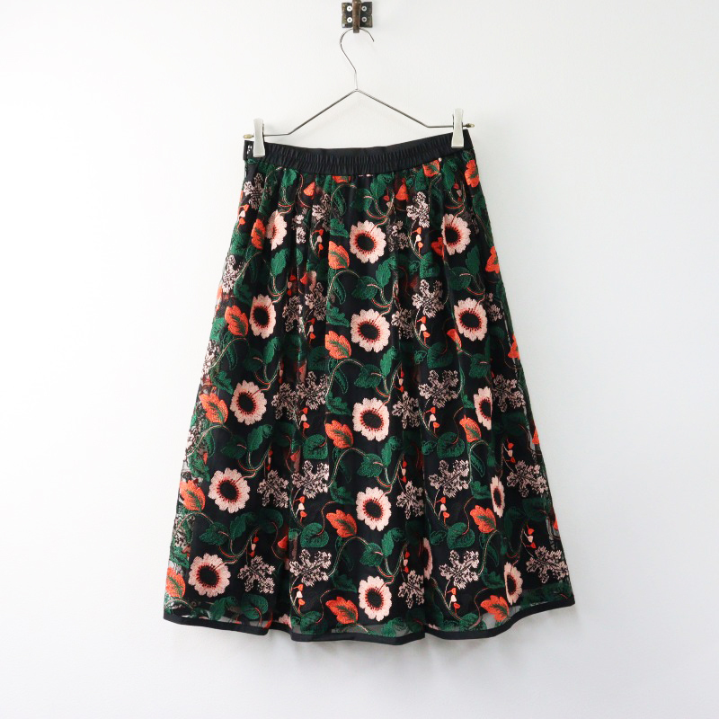 美品 アンレクレ en recre フラワー刺繍チュールギャザースカート 38/ブラック フレア イージー ゴム ロング【2400014536089】