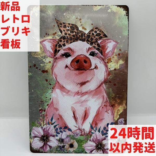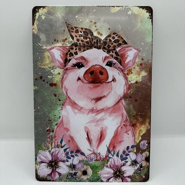 このブリキ看板には、ヒョウ柄のリボンをつけた可愛らしいピンクのブタが描かれています。
