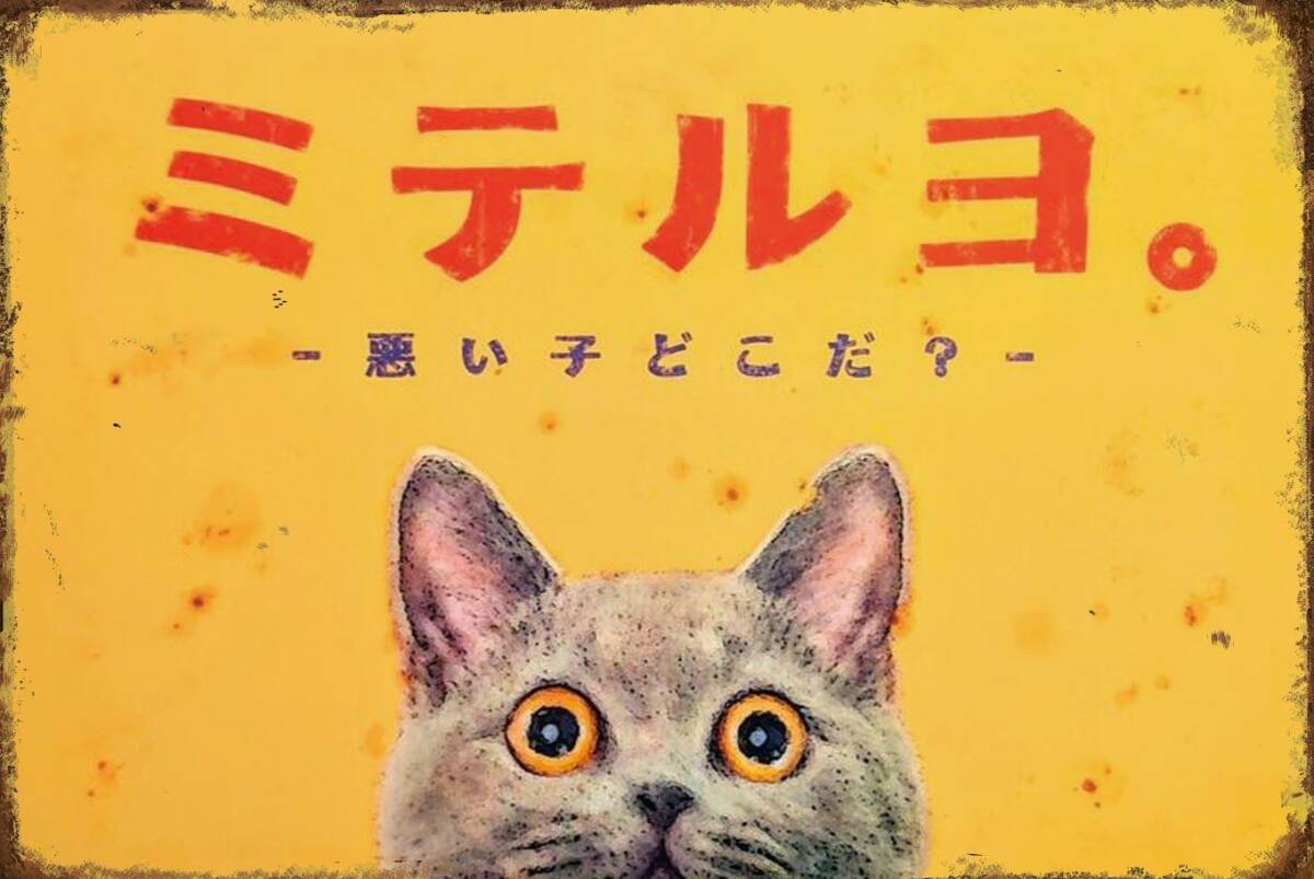 「ミテルヨ。− 悪い子どこだ? −」の文字と驚いた表情の猫が描かれた、ユーモアたっぷりのブリキ看板です。