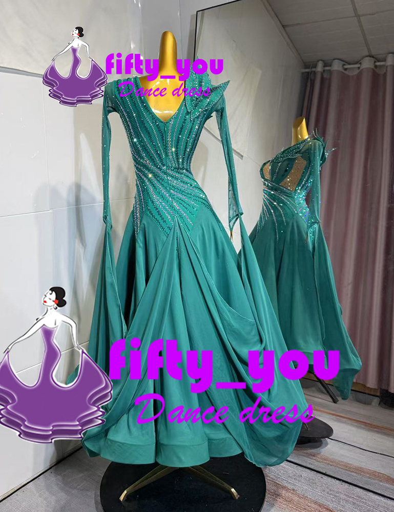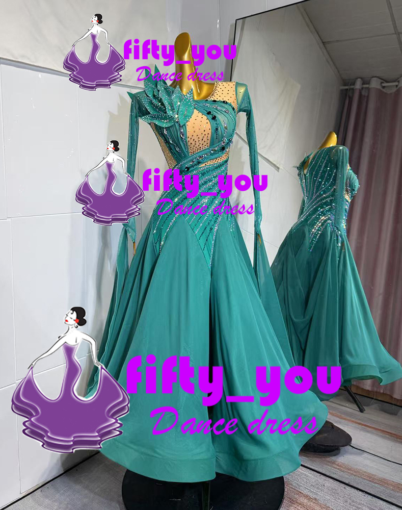 新品fifty_you レディース社交ダンス衣装  スタンダードドレ セミオーダー 競技試合用高級ドレス 立体感 グリーン 色変更可