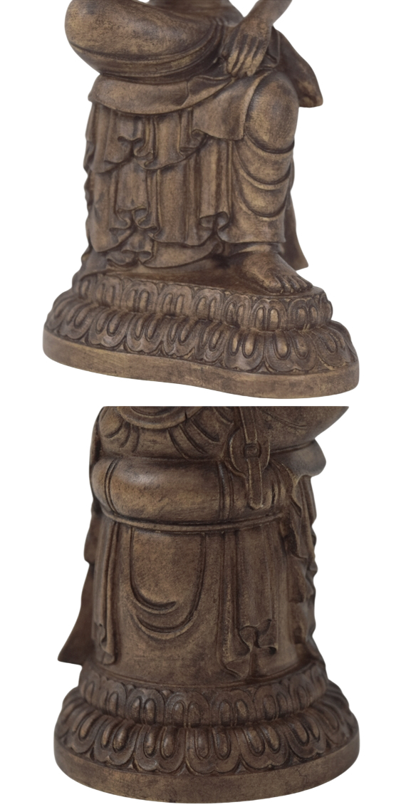 総サイズ:高さ:約12.5cm 下辺の横:約5.5cm 下辺の最大の厚み 約6.5cm 彫り:手彫り&機械彫り 素材:桧木 *手作業にてムラ染めを行っているため、一体一体染まり方が違いますのでオンリーワンの仏像を楽しむことができます。また経年によるかっこいい雰囲気を出すために傷加工を施していますのでアンティーク仏像が好きな方におすすめです |