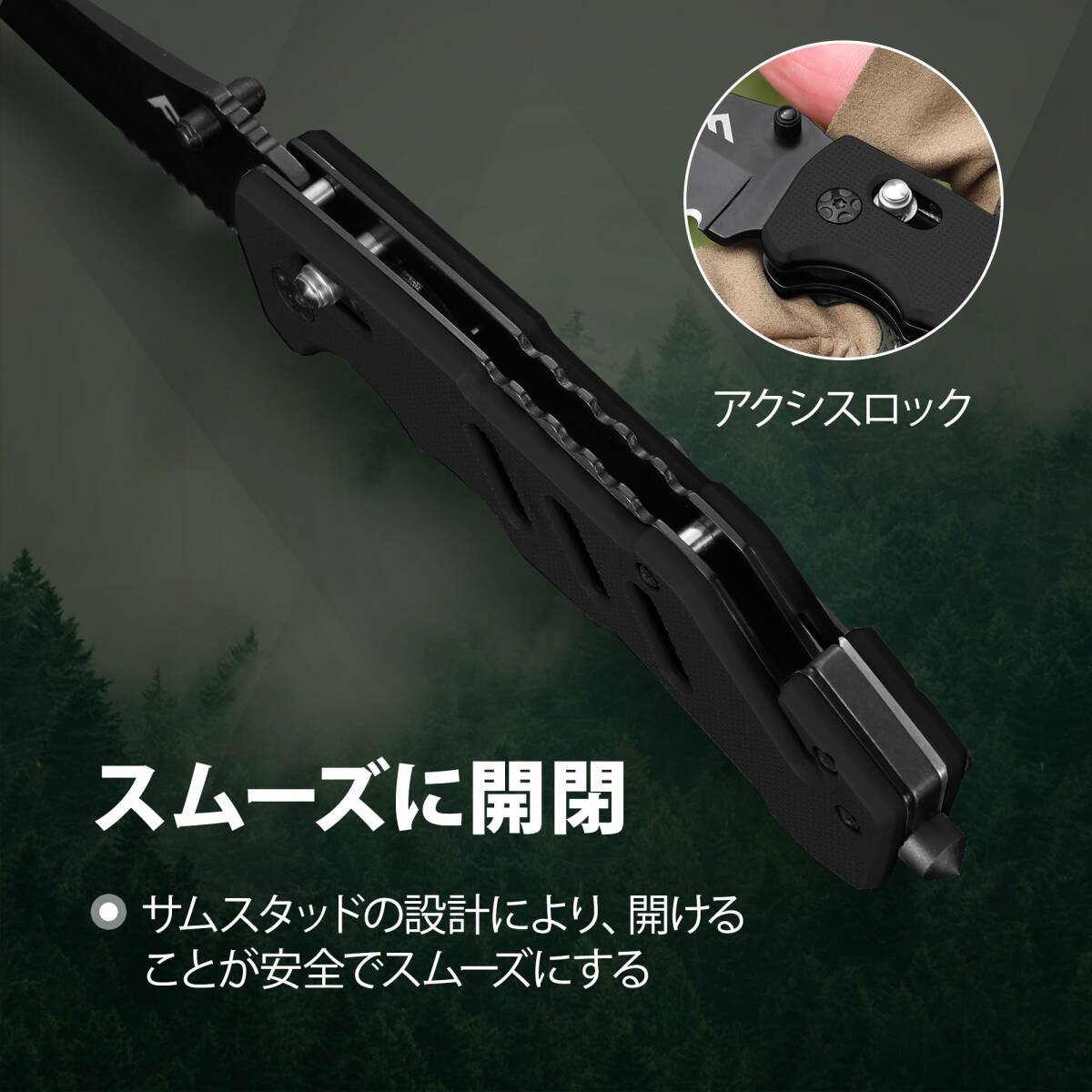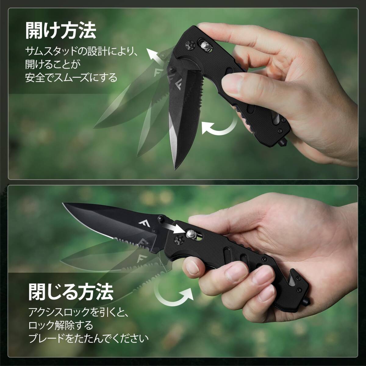 【3-IN-1多機能ナイフ】多機能ナイフとして 、ガラスブレーカー 、シートベルトカッター機能も付いて、日常の使用に便利です。サムスタッドとライナーロックの設計により、開閉がスムーズになります。