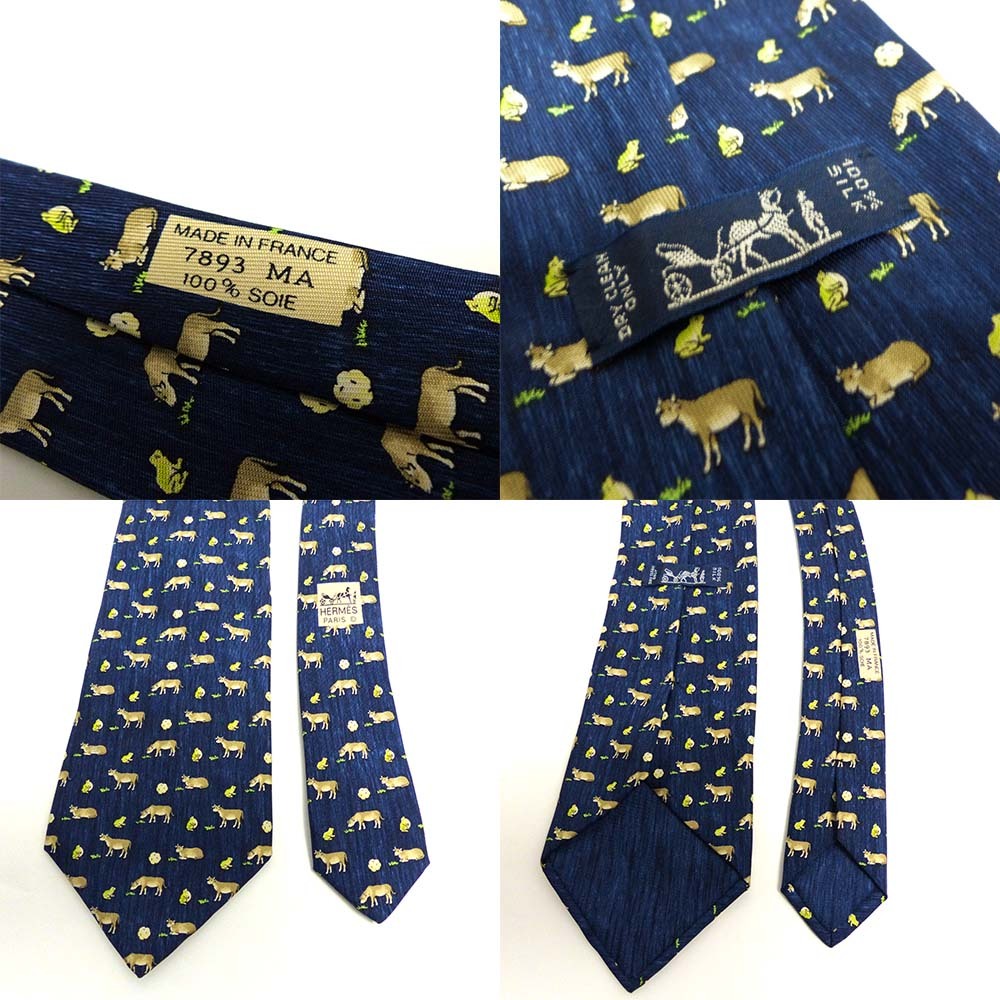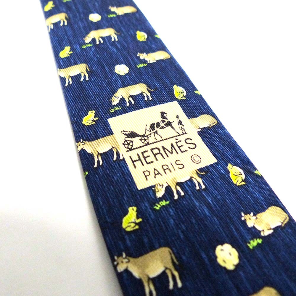 色はネイビー・素材はシルク・Made in France。フランス製 Hermes Silk / ヴィンテージ エルメス 牛柄ネクタイ